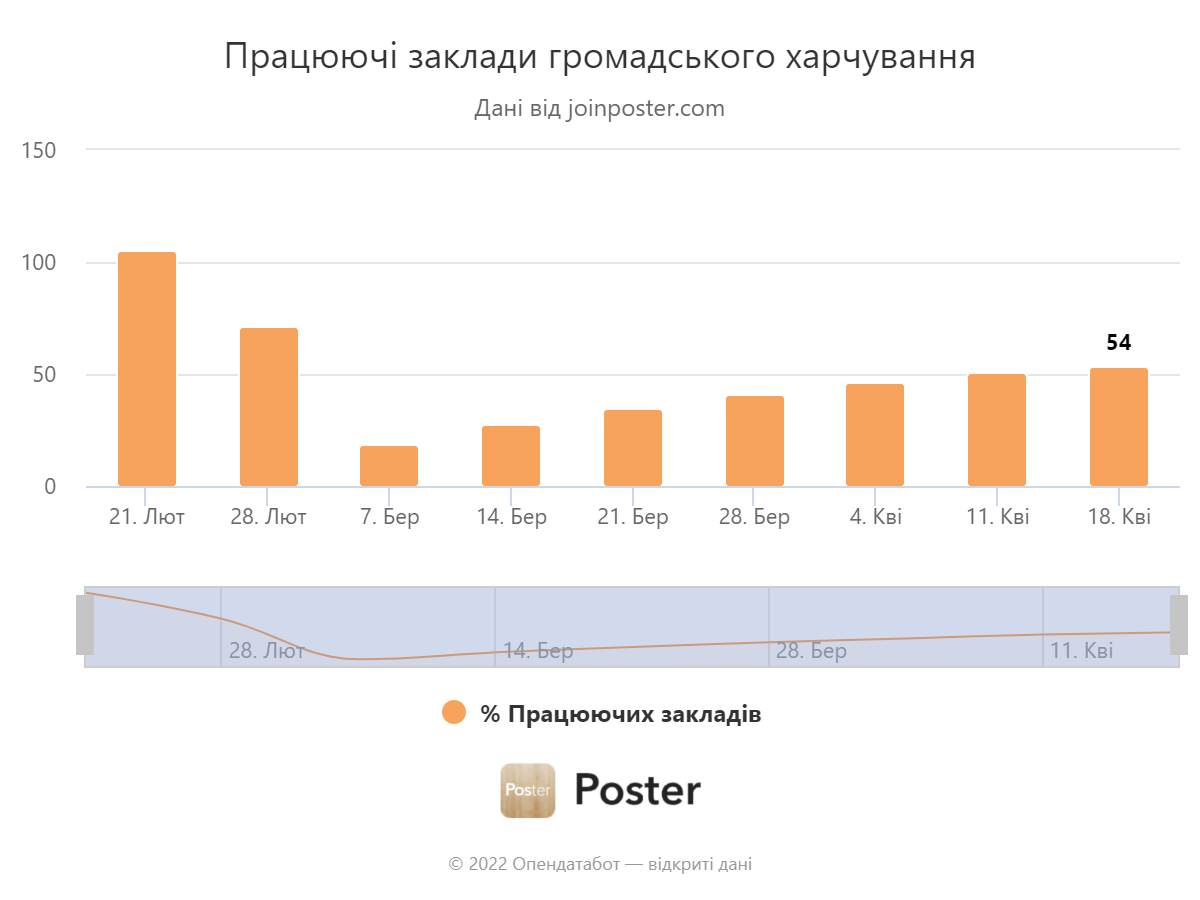 Як повідомляє Liga.net, війна майже зупинила ресторанний бізнес. Багато власників стали годувати армію, деякі – вже знову обслуговують клієнтів. За даними сервісу автоматизації Poster (мова йде про 5000 закладів) в перший тиждень війни в Україні зупинили роботу 80% закладів харчування. Вторгнення вбило бізнес у звичному розумінні, зізнається ресторатор та президент Української ресторанної асоціації (УРА) Сергій Трахачов. Ті, хто залишився або зміг відновити роботу, опинилися у новій реальності. Змінилися меню і ціни, клієнти та їх уподобання.
