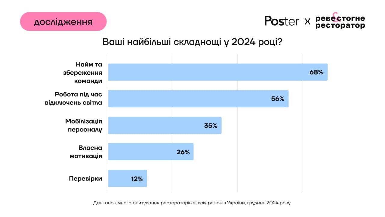 Найскладніше рестораторам у 2024 році було наймати та утримувати команди та працювати під час відключень світла. Окрім цього, підприємців турбувала мобілізація персоналу, власна мотивація працювати та перевірки бізнесу.