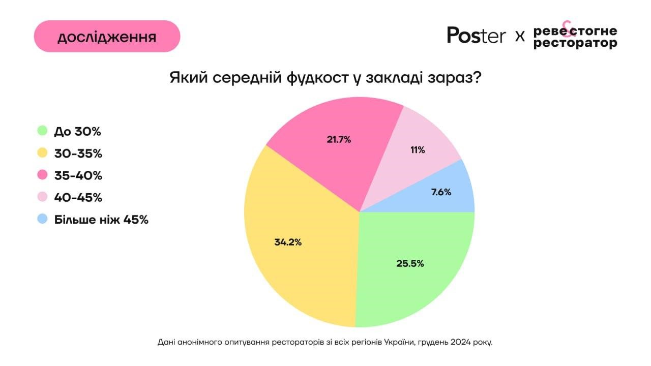 34% опитаних рестораторів відзначили, що працюють з фудкостом 30-35%. Тільки чверть мала фудкост до 30%.