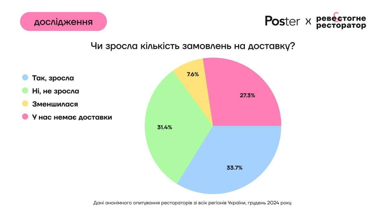 34% рестораторів заявили, що кількість замовлень на доставку у 2024 році зросла, майже стільки ж опитаних (31%) не помітили збільшення замовлень.