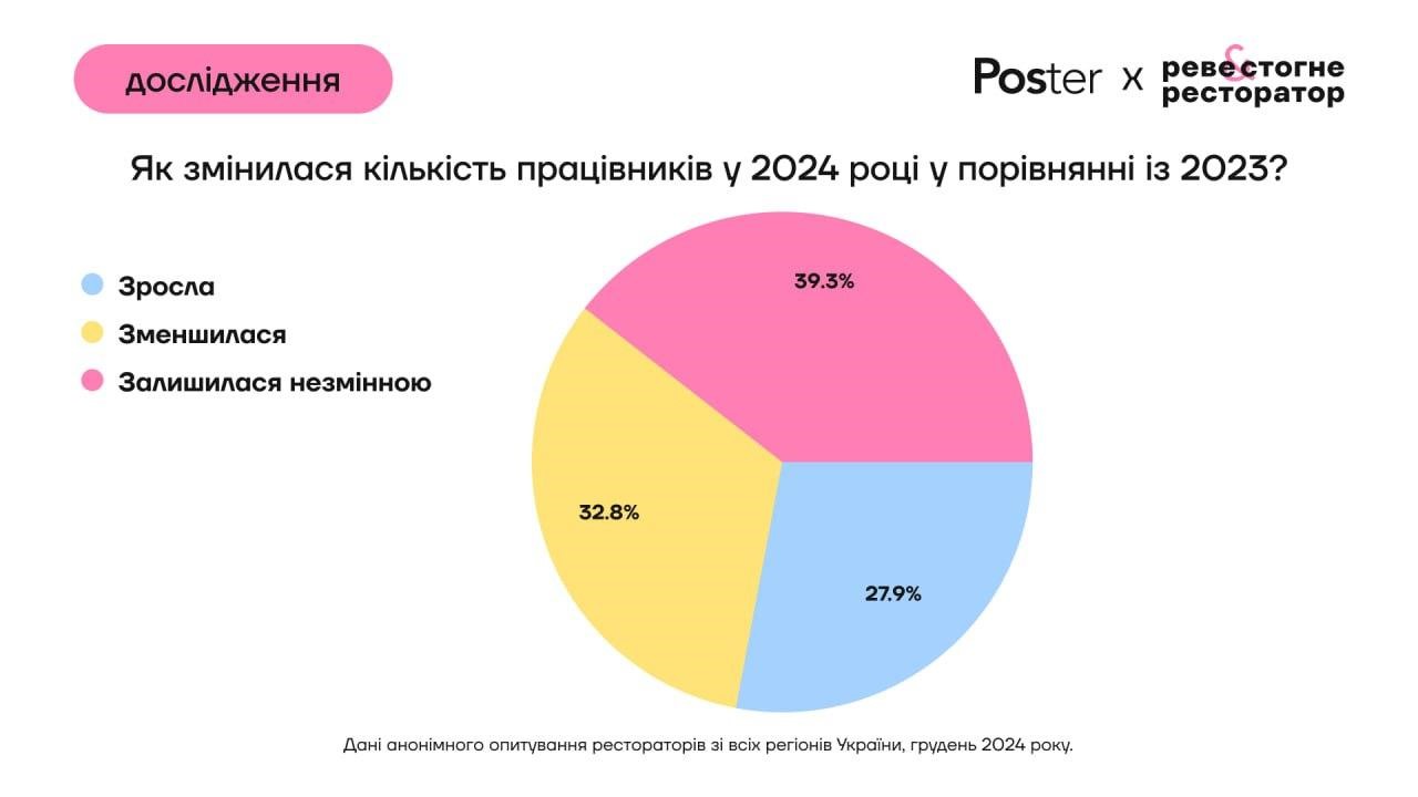 39% рестораторів змогли зберегти команду у 2024 році у тій же кількості, а 28% навіть залучили нових працівників.