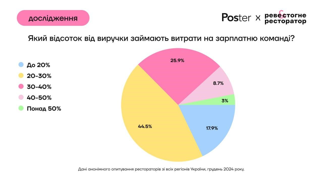 Більшість рестораторів витрачали на зарплатню команді у 2024 році 20-30% від виручки. При цьому 12% опитаних витрачали на зарплатню понад 40% виручки закладу.