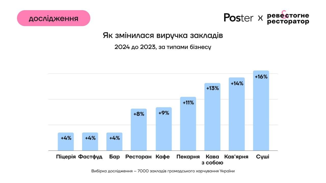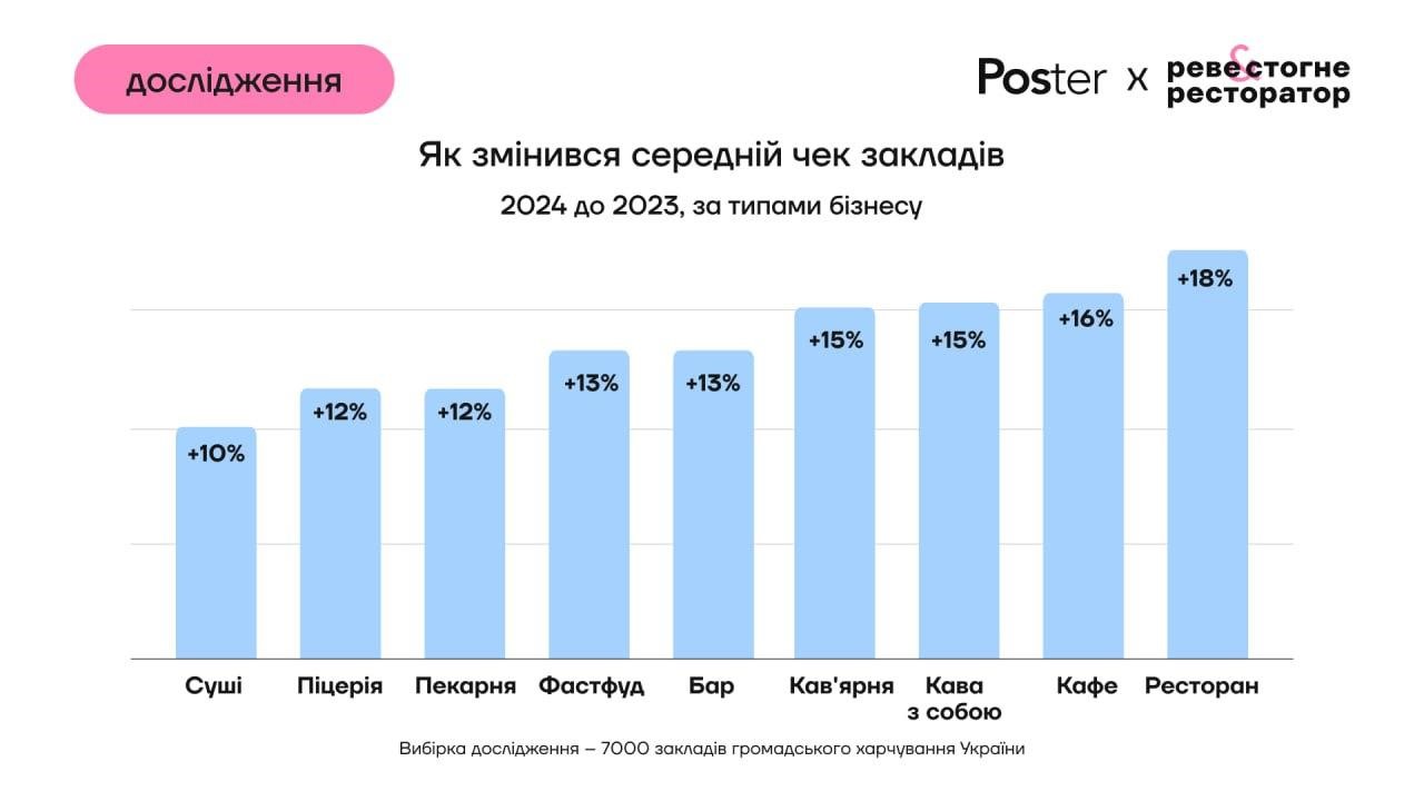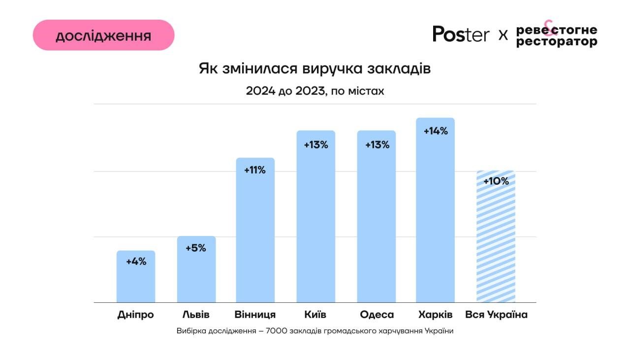 Виручка закладів громадського харчування України у 2024 році зросла на 10% у порівнянні з 2023 роком, cередній чек — на 17% внаслідок збільшення цін. При цьому відвідуваність впала на 3%, серед причин падіння – економічна невизначеність та посилення мобілізації.