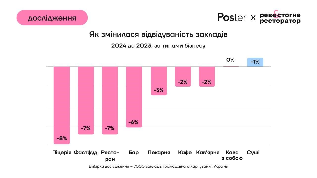 Відвідуваність майже всіх типів закладів знизилася у 2024 році у порівнянні із 2023-м. Найбільше просіли показники у піцерій, фаст-фуду та ресторанів – на 8% та 7% відповідно. Позитивну динаміку показали суші – зростання на 1%, а відвідуваність закладів, де продають каву з собою, залишилася без змін.