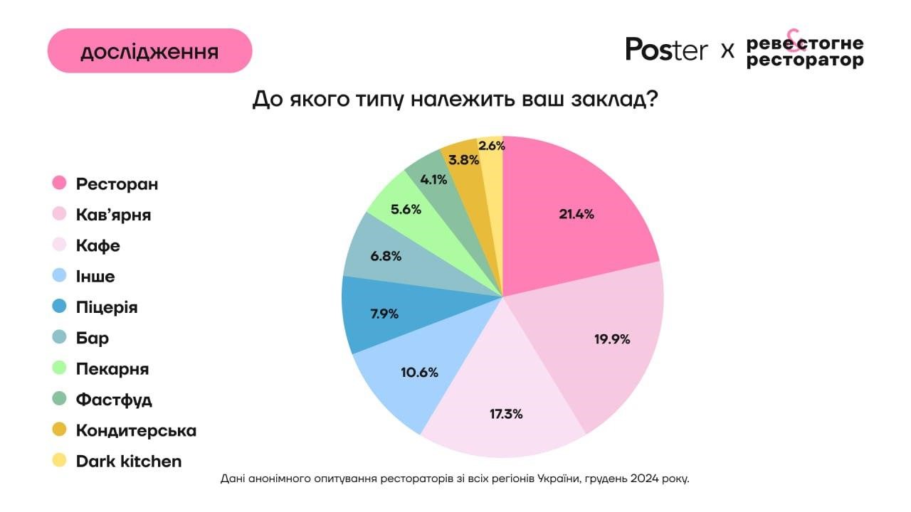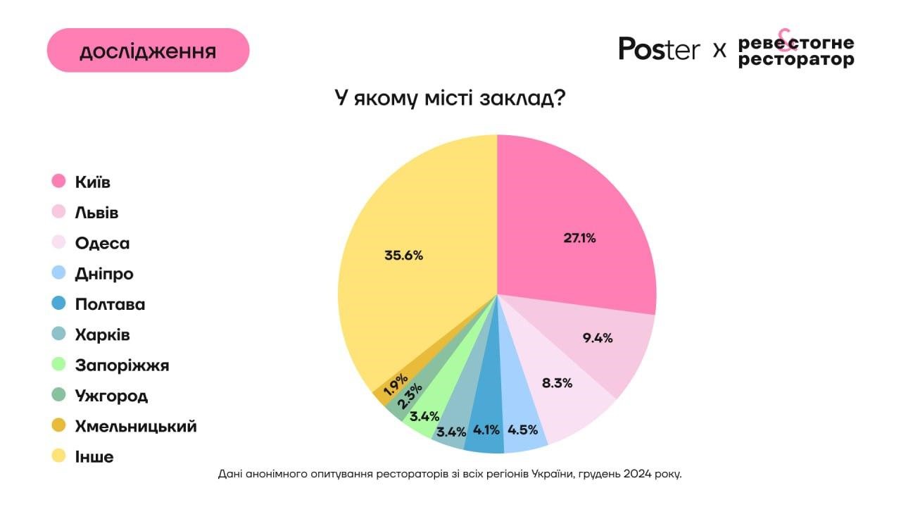 Дані в цьому розділі ґрунтуються на анонімному анкетному опитуванні рестораторів зі всієї України. Опитування проведене в ресторанному медіа «Реве та стогне ресторатор» у грудні 2024 року. Всього форму заповнило близько 300 респондентів. Переважна більшість – з Києва та великих обласних центрів. Серед типів бізнесу переважають ресторани, кафе та кав’ярні.