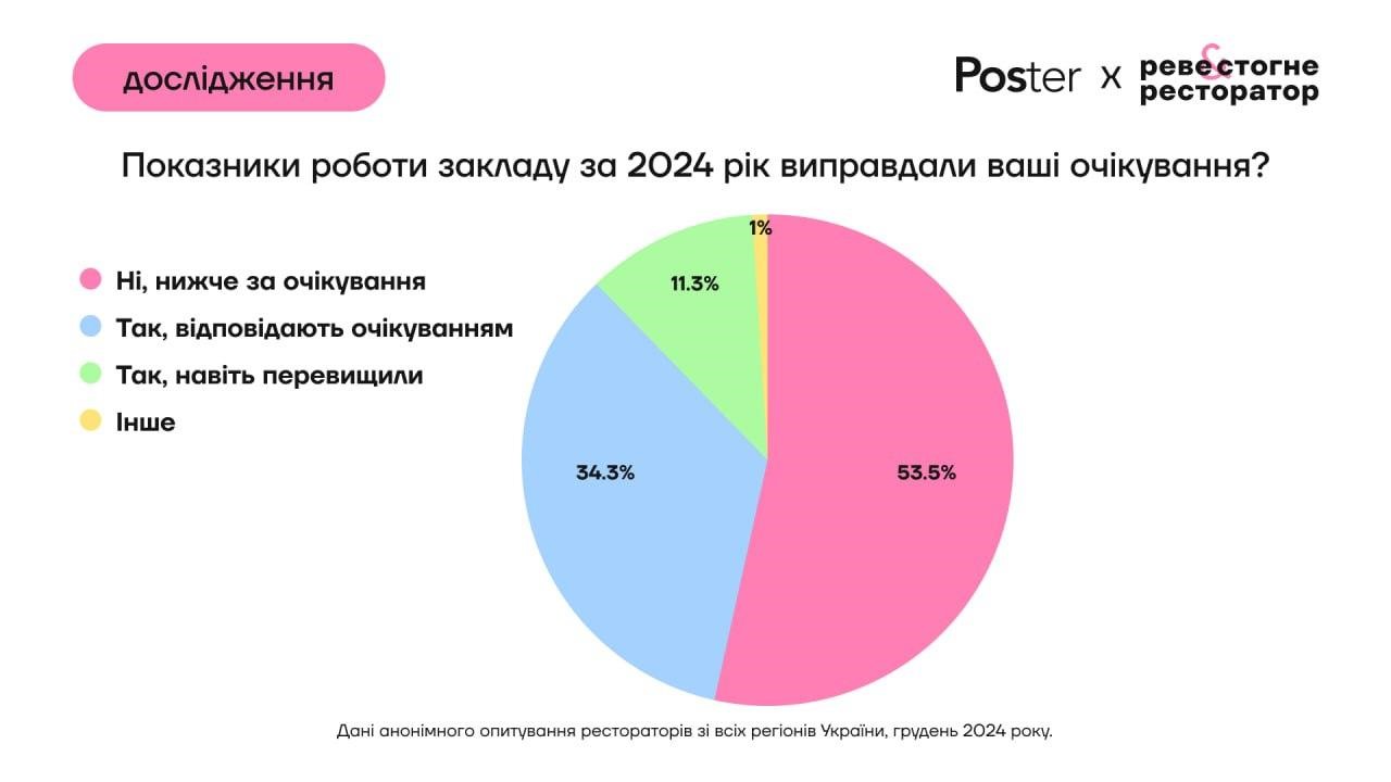 54% опитаних рестораторів зазначають, що показники роботи закладів у 2024 році є нижчі за очікувані. В дослідженні минулого року таких респондентів було 43%. Тим часом 11% опитаних вважають, що показники навіть перевищили очікування.