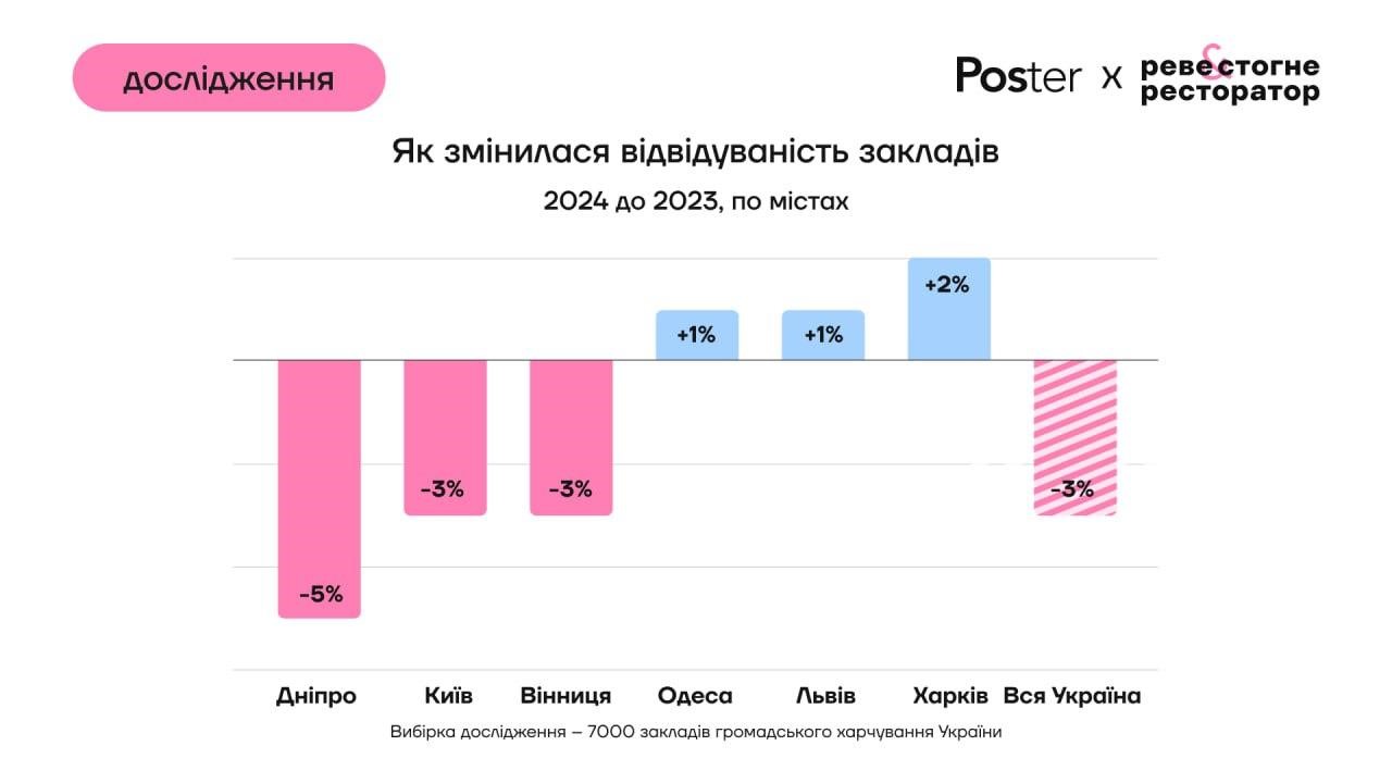 Серед найбільших міст України найгіршу річну динаміку відвідуваності показав Дніпро. Там відвідуваність закладів впала на 5% у 2024 році у порівнянні із 2023-м. Краще ніж уторік ситуація виявилася в Харкові – зростання на 2%, Львові та Одесі – зростання на 1%. Негативну динаміку відчули в закладах Києва та Вінниці – мінус 3%.