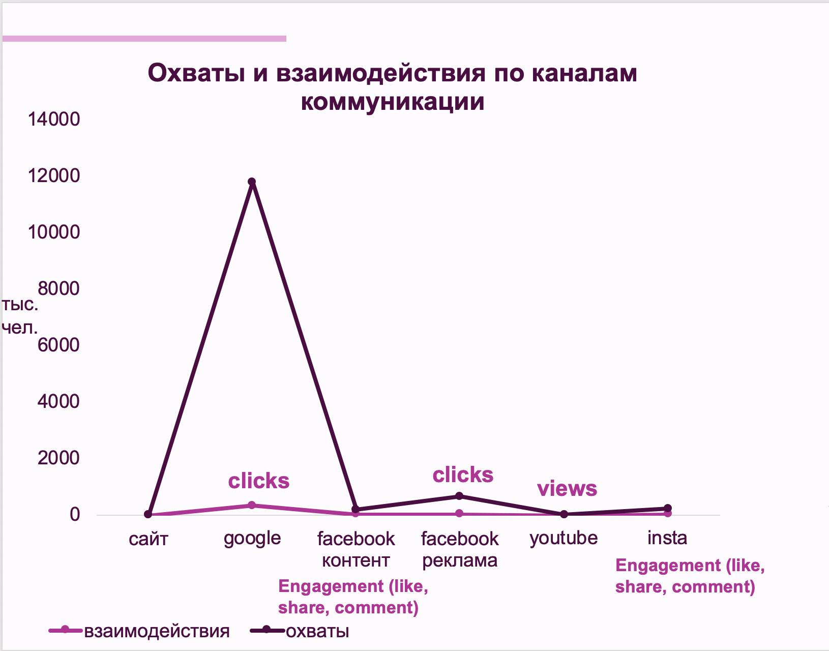 У звіті теплі та холодні цифри відображаються у зведеній діаграмі показників ефективності по кожному digital-каналу, включаючи вартість цільової дії у кожному каналі. Щомісячний аналіз діаграми дозволяє оптимально розподіляти бюджет між каналами, нарощуючи аудиторію та частоту взаємодії. Наприклад, якщо ми бачимо стабільно зростаючу динаміку переглядів Instagram-сторіс протягом 2-3 місяців, необхідно переформатувати частину контенту саме під успішний формат, збільшити конверсію завдяки природному зростанню популярності та скоротити витрати.