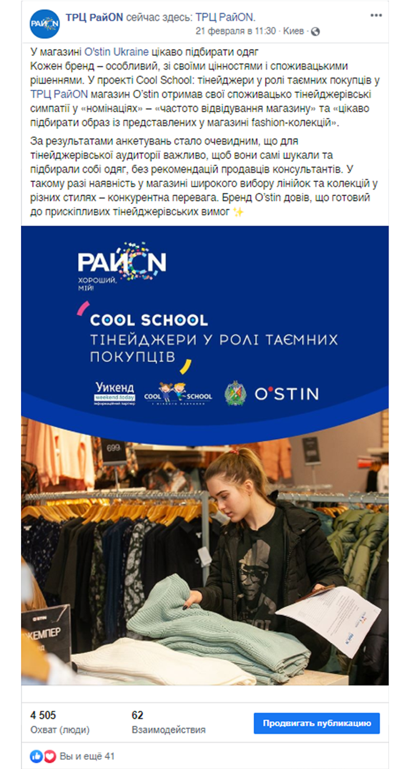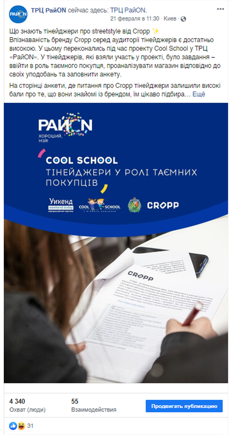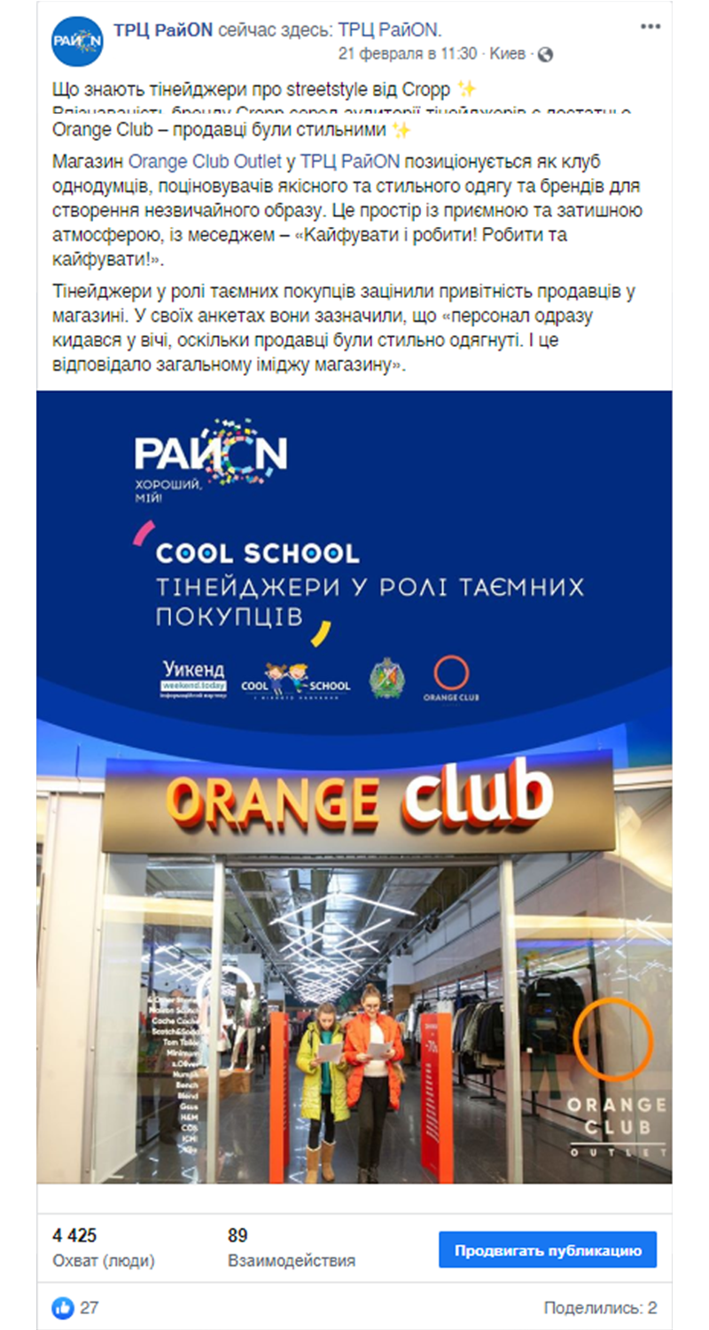 У ТРЦ РайON, який розташований у густозаселеному районі Києва, ми провели експериментальний соціально-освітній проект Cool School: «Тінейджери у ролі таємних покупців», головними героями якого стали учні старших класів, їхні вчителі, fashion-бренди та їх продавці-консультанти. Усім учасникам проект настільки сподобався, що ми продовжили: «Тінейджирм у ролі кінокритиків» та «Тінейджери у ролі блогерів та інфлуенсерів».