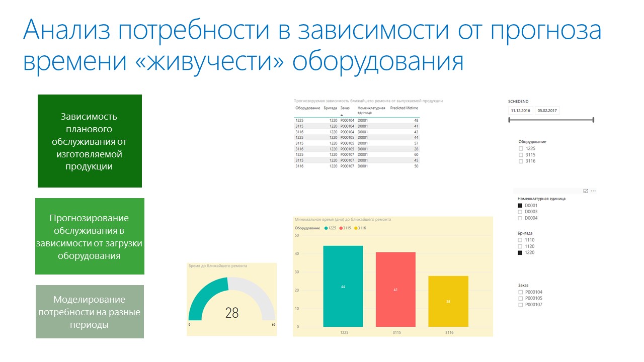 Зазвичай компанії приблизно знають, що і коли вийде з ладу, орієнтуючись на планові показники, але часто щось йде не так. Щоб врахувати несподівані фактори і передбачити непередбачені ремонти, в компанії розробили модель в інтеграції з технологією Internet of Things. З одного боку в якості джерел використовували ЕRP-систему, яка дає дані завантаження виробничих потужностей і ресурсів, а з іншого боку – прогнозну модель. Наприклад, якщо обладнання стоїть на вулиці, то потрібно врахувати кількість сонячних днів. Далі додають статистичні дані по ремонтам.