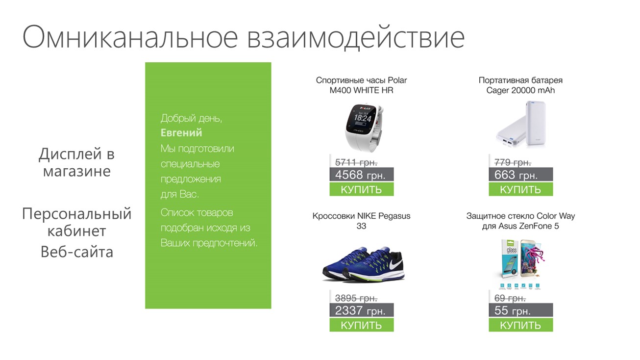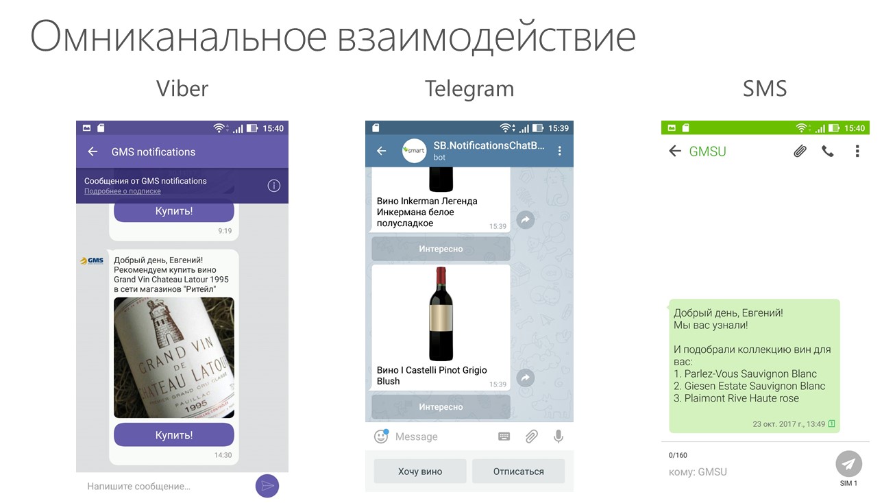 У Telegram клієнт може отримати цілих три рекомендації. Можна будувати і більш складні сценарії: коли клієнт говорить “так, мені цікаво”, можна відразу ж запропонувати йому знижку, бонус. Якщо йому нецікаво, ми, знизимо цінову категорію і запропонуємо три інших вина з більш низької цінової категорії. Це може працювати навіть на базі SMS. Красивим завершенням такого сценарію буде повідомлення: “Ось промокод на цей товар, він діє 30 хвилин, чекаємо вас на касі!”