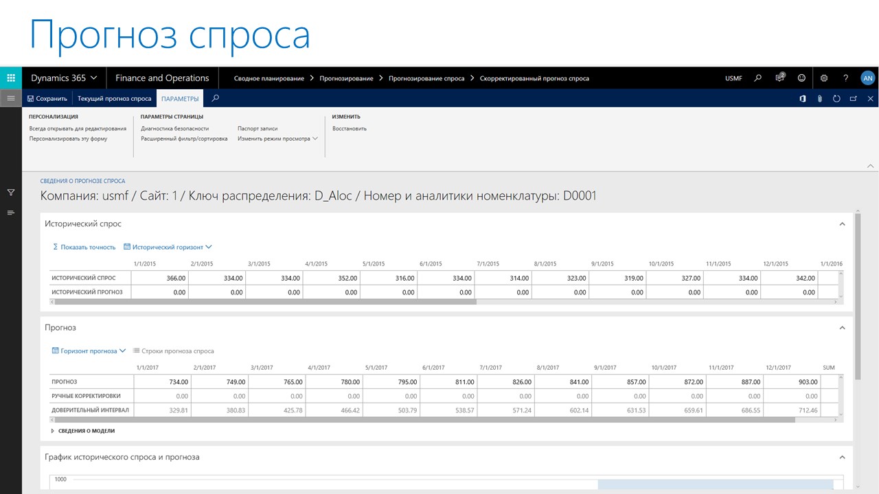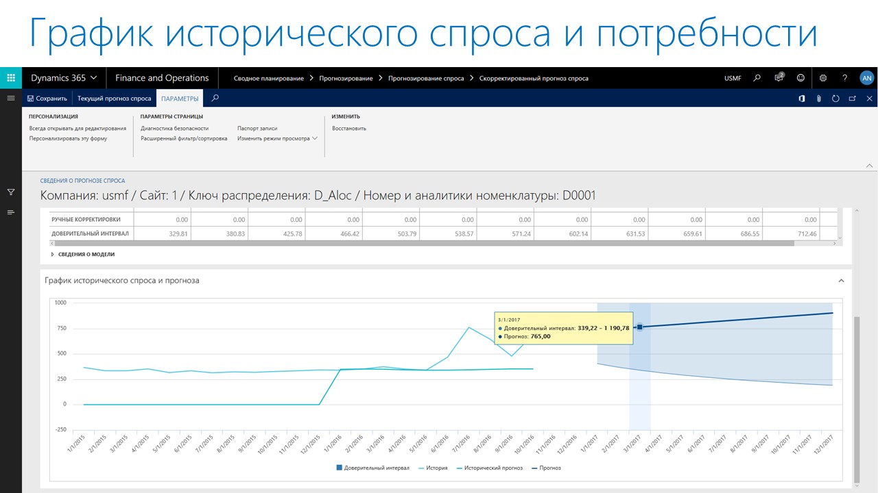 На фото – приклад: з даних попиту по датах система зробила прогноз на наступні два роки. Після того як дані потрапили в систему, модель дає можливість планування і прогнозування, практично на невизначений період, грунтуючись на даних як всередині ЕRP-системи, так і на зовнішніх даних.