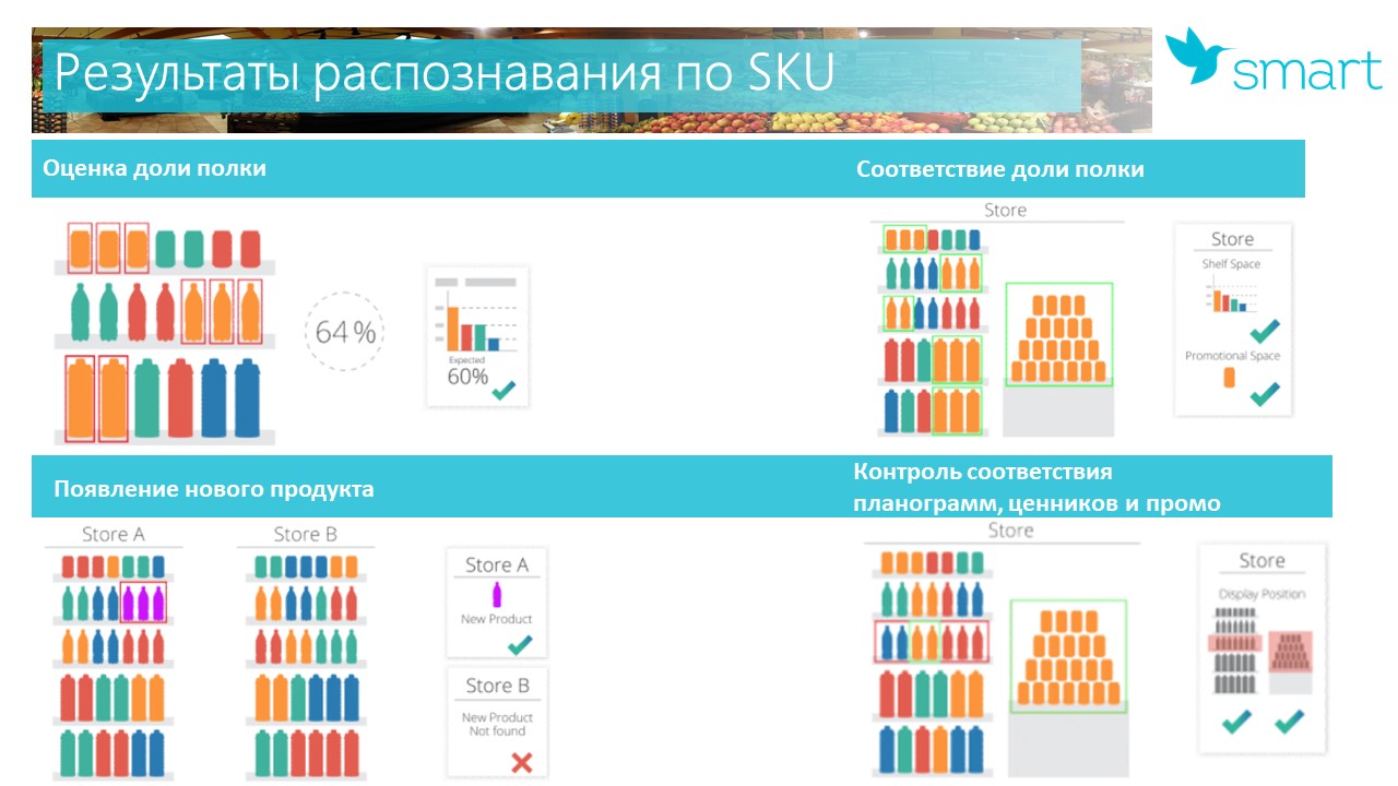 Є звіт “оцінка частки полки”, в тому числі і в порівнянні з конкурентами, звіт появи нового продукту в realtime-статистиці. Можливий контроль відповідності з планограмою, цінником, промо акцією.