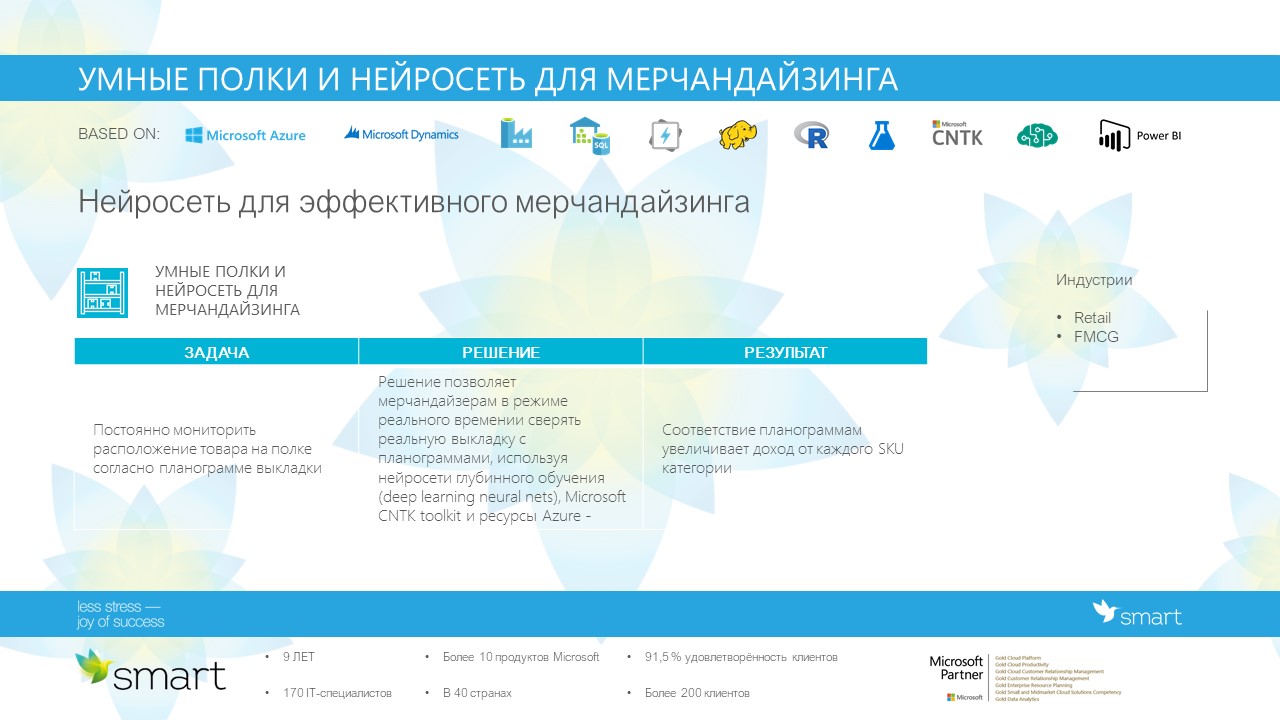 Рішення побудоване з використанням алгоритмів нейромереж, працює на базі платформи Azure Microsoft і використовує технології машинного навчання Microsoft. Візуальна аналітика будується на базі Power Bi і дозволяє розпізнавати товар на фото під кутом до 30 градусів.