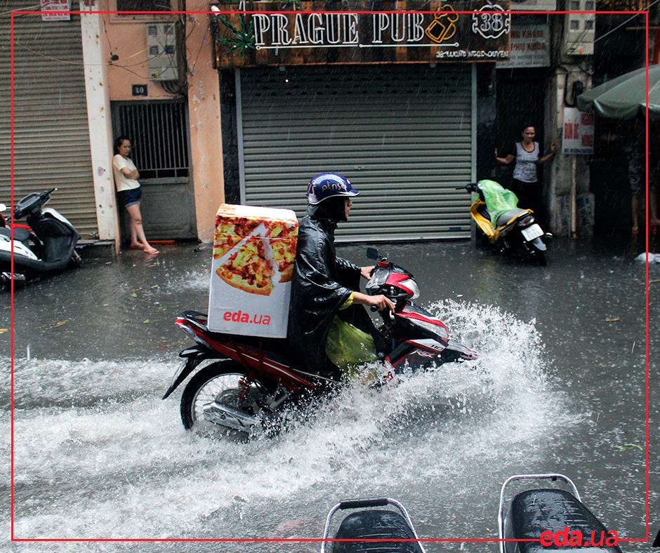 В Eda.ua теж переконані в можливостях своєї доставки, головне, щоб їх кур’єри були згодні з SMM-щиками. На фото насправді в’єтнамська доставка піци HANG NGAY, де, як відомо, набагато більше адаптовані до тропічних опадів.