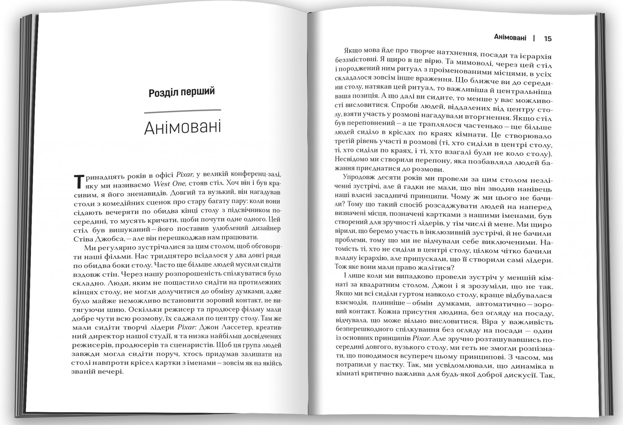 Таких принципів з прикладами того, що цей механізм працює, запропоновано чимало. Тому книга буде цікава як тим, хто цікавиться історією успіху Pixar, так і всім, хто сфокусований на проблемах менеджменту та управління творчою командою.