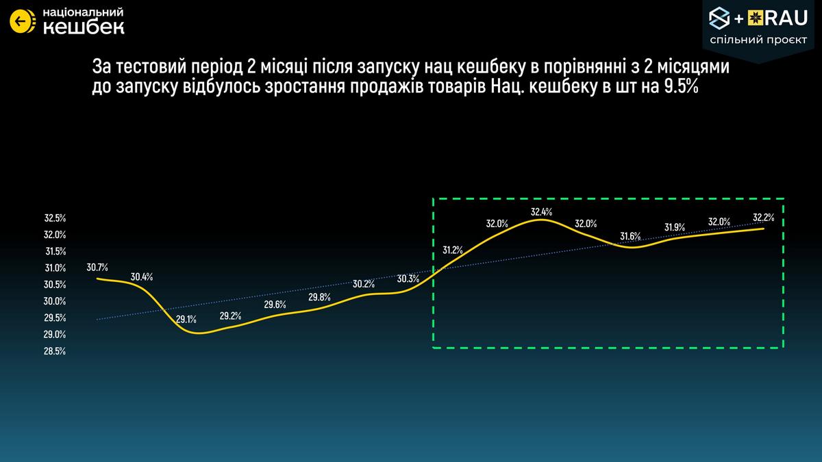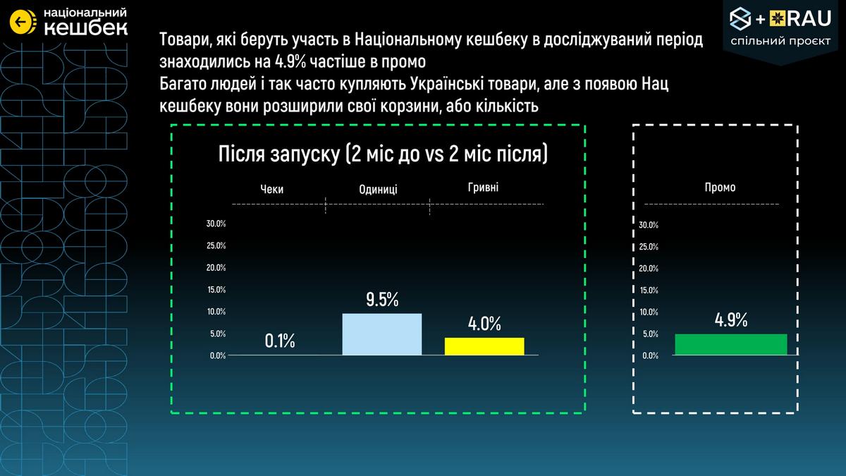 Це не аналіз результативності найбільшої промоакції з великим залученням товарів, а саме аналіз її старту. Наразі можна сказати, за два місяці люди стали купляти на 10% більше товарів національного виробництва, які приймають участь в програмі «Національний кешбек». І мова йде саме про продукти харчування.