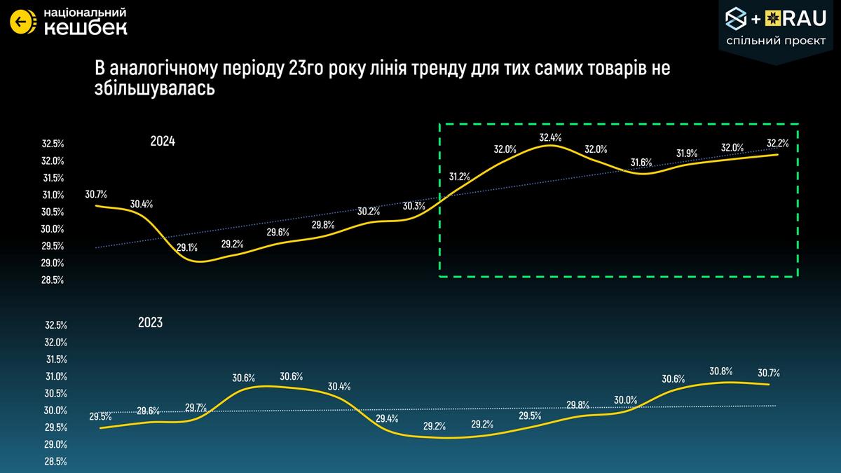 Якщо проаналізувати аналогічний період минулого року, то лінія тренду для тих самих товарів майже не змінювалася в 2023 році. Що підкреслює важливу роль “Національного кешбеку” в стимулювання попиту на українську продукцію.