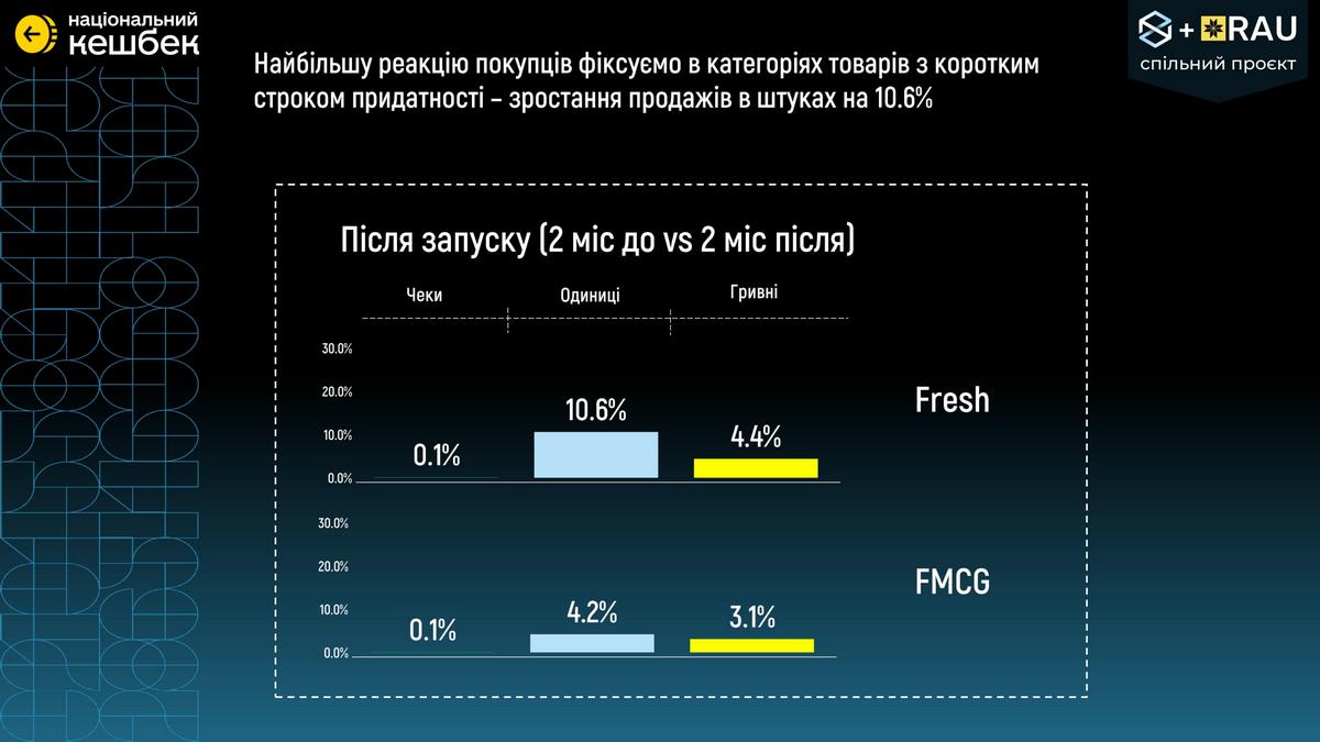 Аби зрозуміти, які товари та в якому ціновому сегменті найбільше вплинули на перші результати програми, експерти з’ясували, що кількість придбаних товарів з коротким терміном придатності зросла аж на 10,6% в штуках порівняно із двомісячним періодом до старту програми. Це в 2,5 раза більше за динаміку всієї категорії товарів FMCG (4,2%). В категорії Fresh входять молочка, хліб, м’ясо, все, що швидко псується. Водночас у FMCG вже більше запакованих товарів з більшими термінами придатності. Тут так само кількість чеків майже не змінилася, а виторги збільшилися на 4,4% в категорії fresh, проти 3,1% в категорії FMCG загалом.