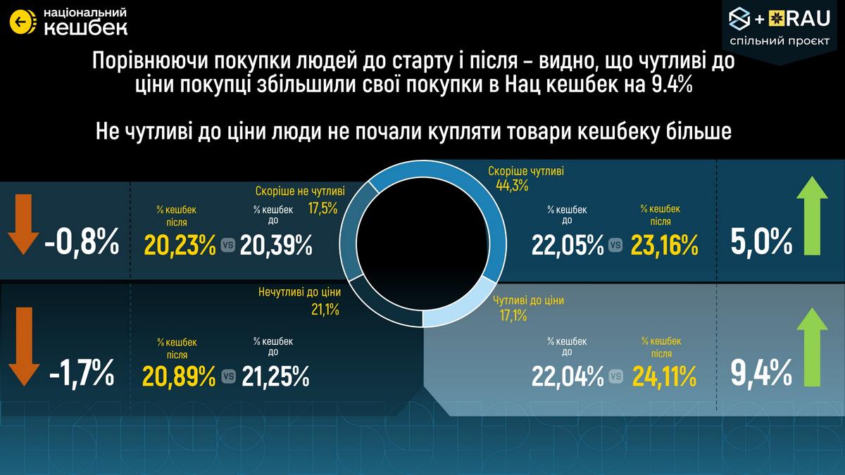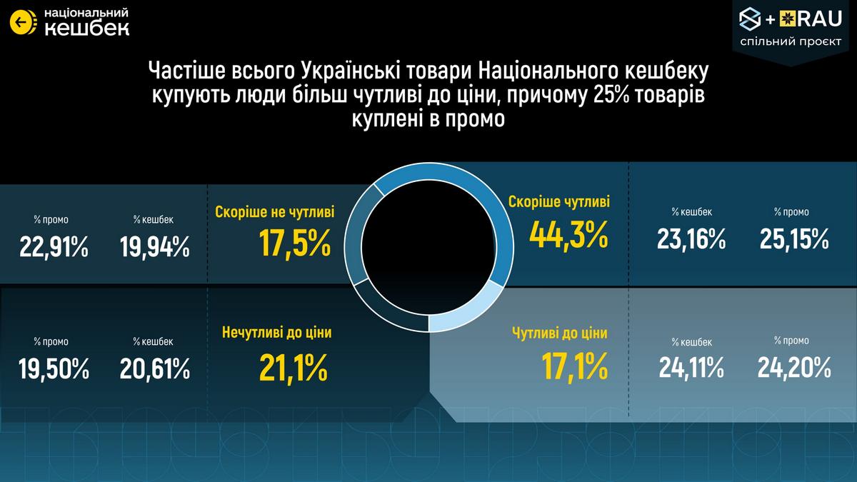 Так, чутливі до ціни люди мають в середньому до 24% товарів з «Національного кешбеку» та досить активно реагують на промо. Таких домогосподарств в Україні 17%.