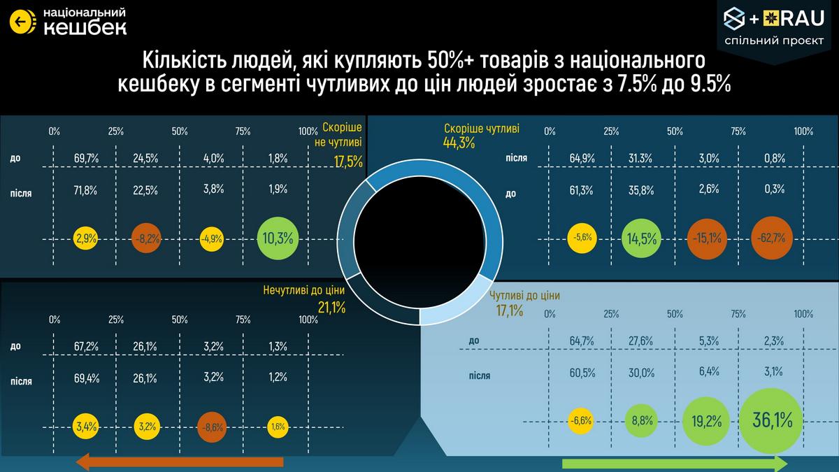 Тобто на старті програми більший вплив «Національний кешбек» (як підтримка, яку відчувають люди, або як чинник для переключення з інших виробників на національних) має на чутливих до ціни людей.