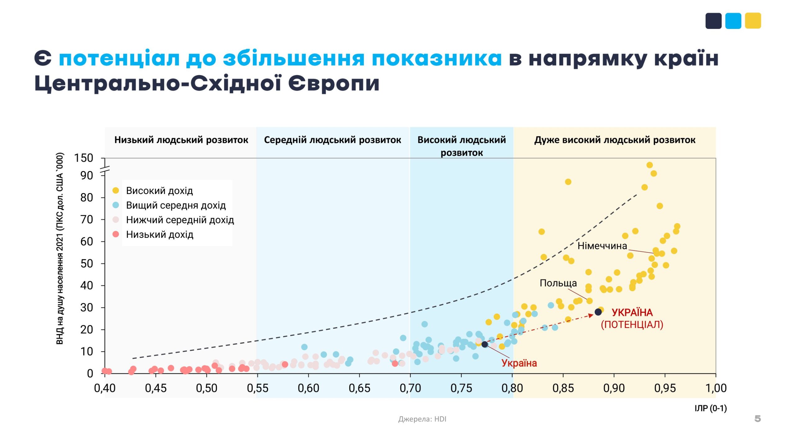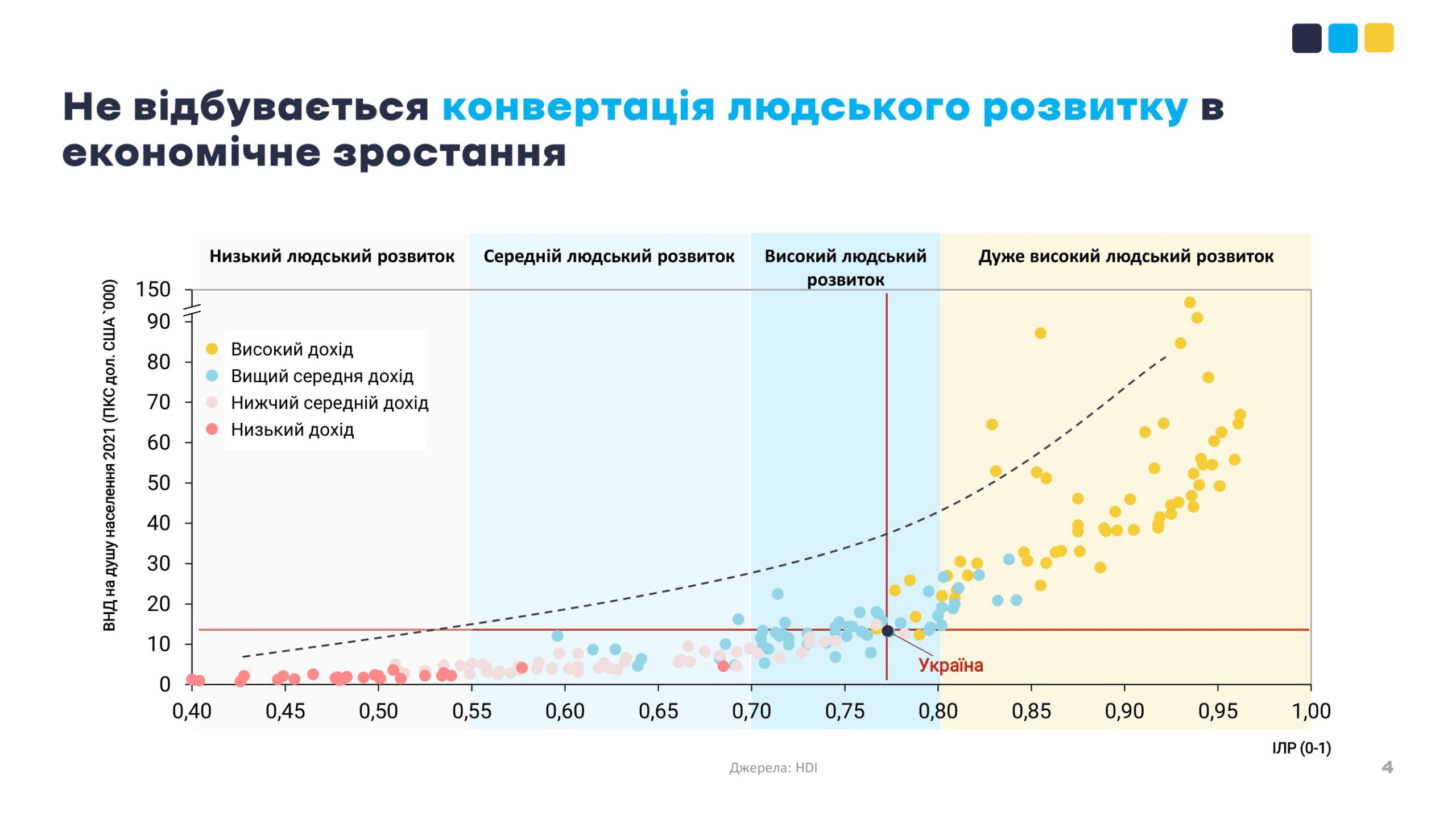 Хоча Україна й відноситься до країн з високим розвитком людського капіталу, вона ще не знайшла відповідні інструменти конвертації цього потенціалу в високі показники економічного зростання.