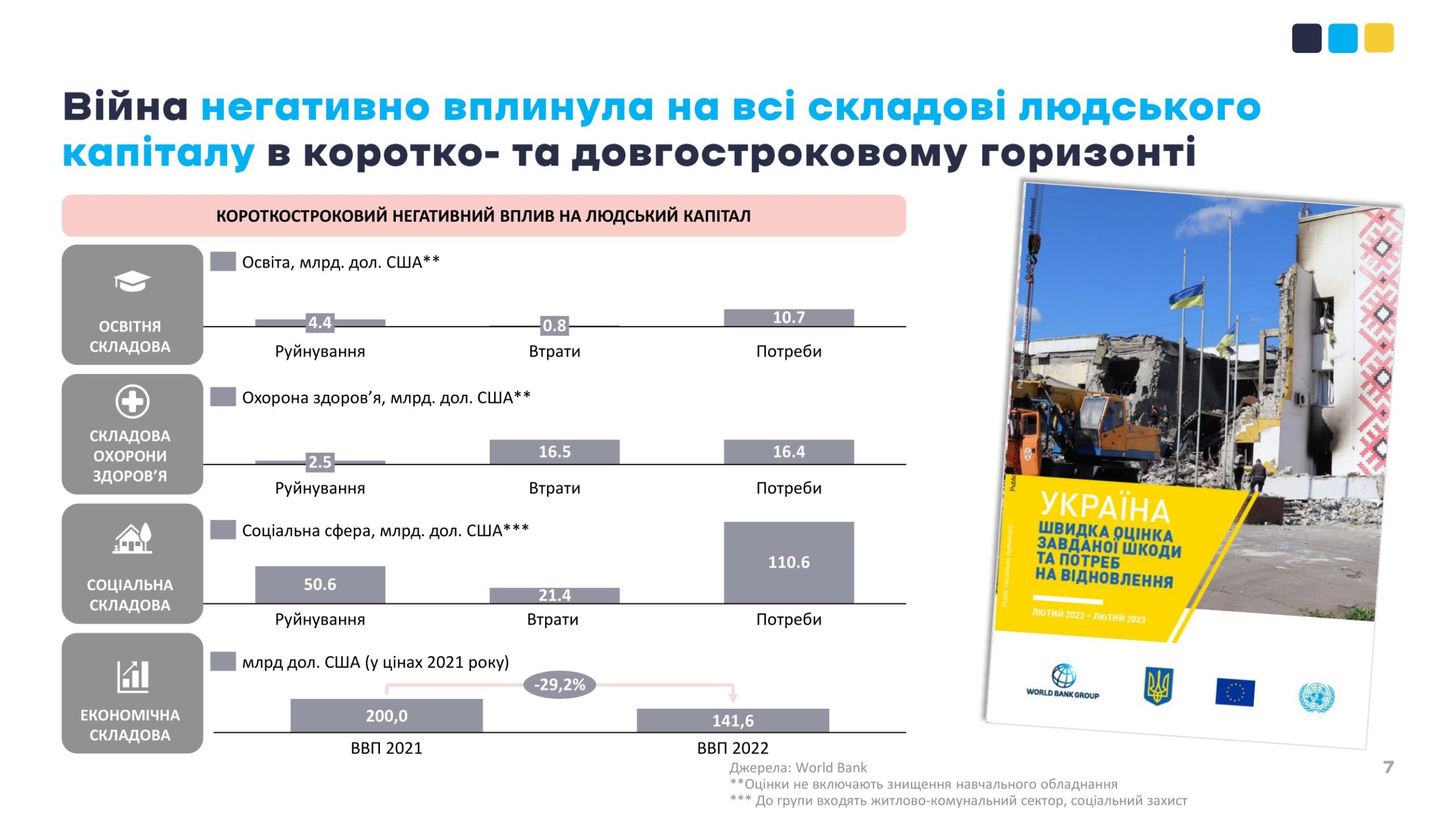 На початку 2023 року Світовий банк в партнерстві з ЄС, КМУ та ООН випустив звіт під назвою «Швидка оцінка завданої шкоди та потреб на відновлення в Україні». В ньому експерти оцінили вплив повномасштабних воєнних дій в Україні на сфери освіти, охорони здоров’я, соціальну та економічну складові людського капіталу. Зокрема, тільки втрати у соціальній сфері (зруйноване житло та інфраструктура) оцінювалися на рівні $110,6 млрд або 78% ВВП за 2022 рік.