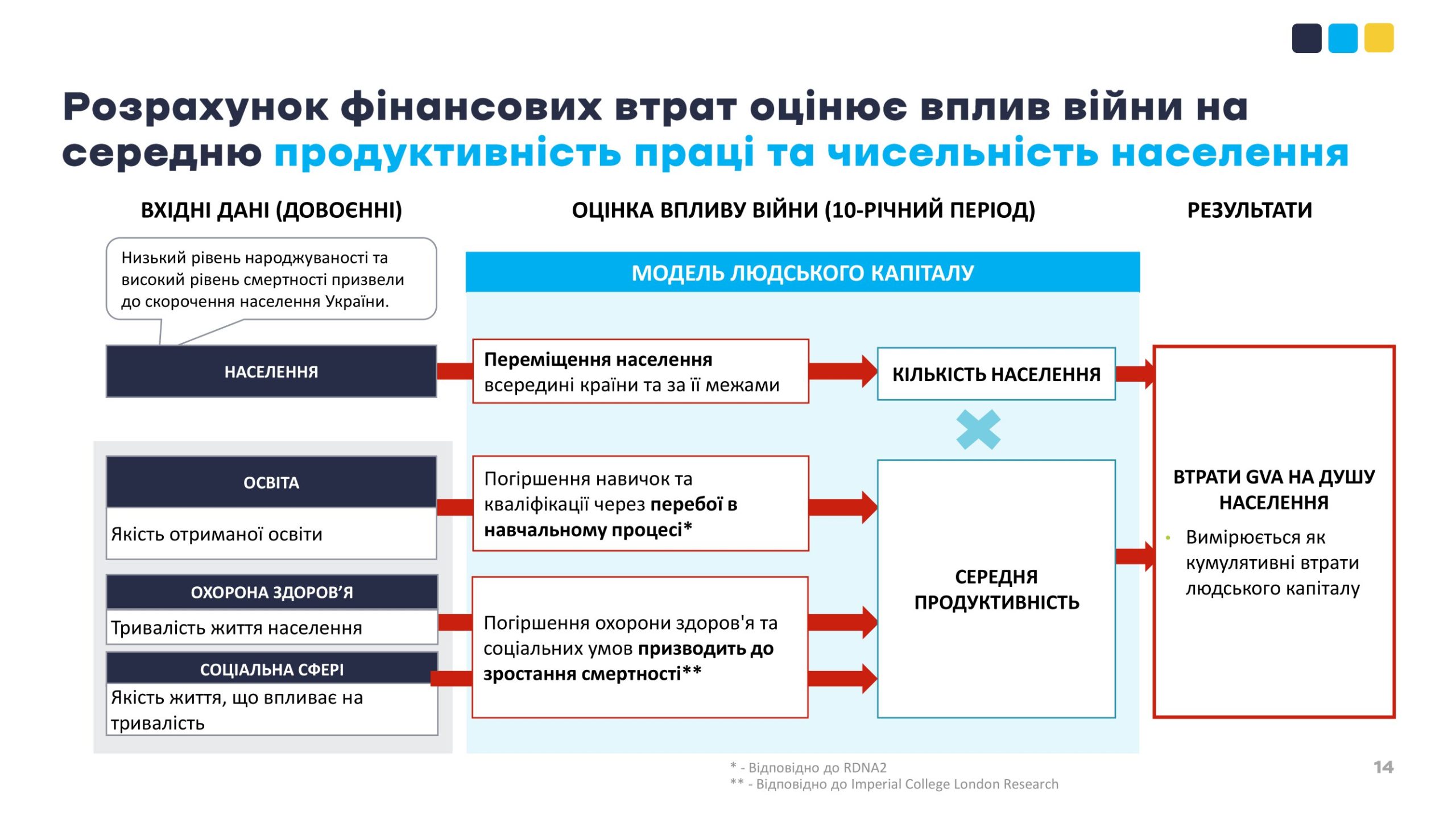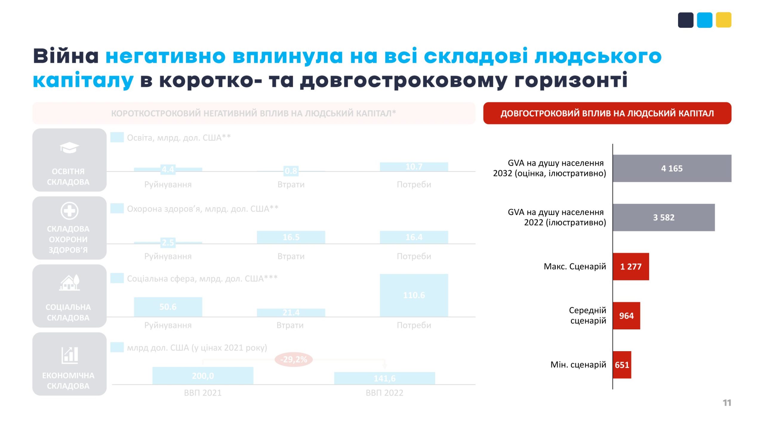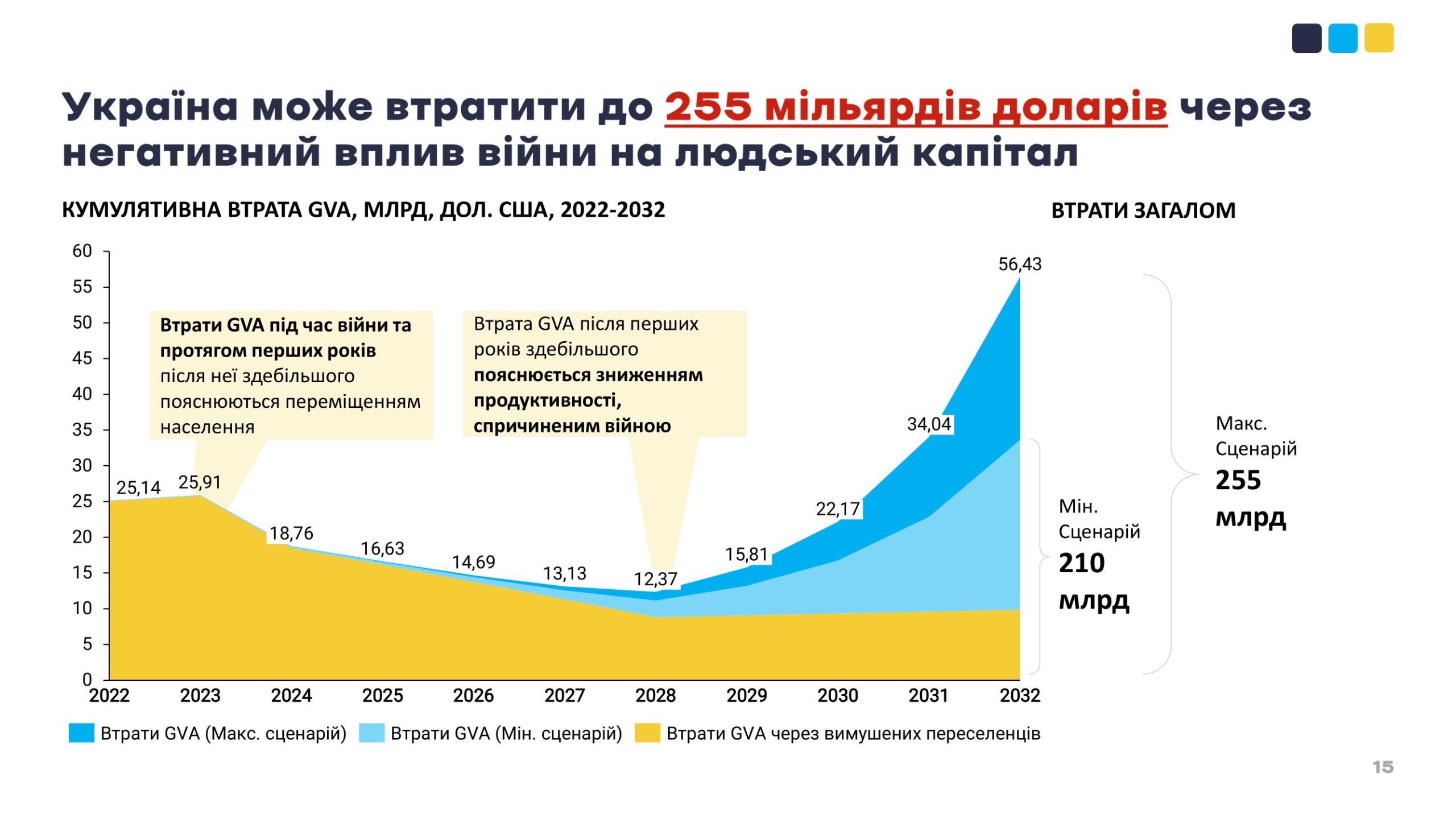 Якщо нічого не робити, то за найгіршим сценарієм йтиметься про $255 млрд недоотриманого ВДВ (або GVA). Це втрати через значну кількість вимушених переселенців та недоотримання українцями доступу до освіти, медичних послуг тощо. За найліпшим сценарієм ці втрати становитимуть «лише» $210 млрд.
