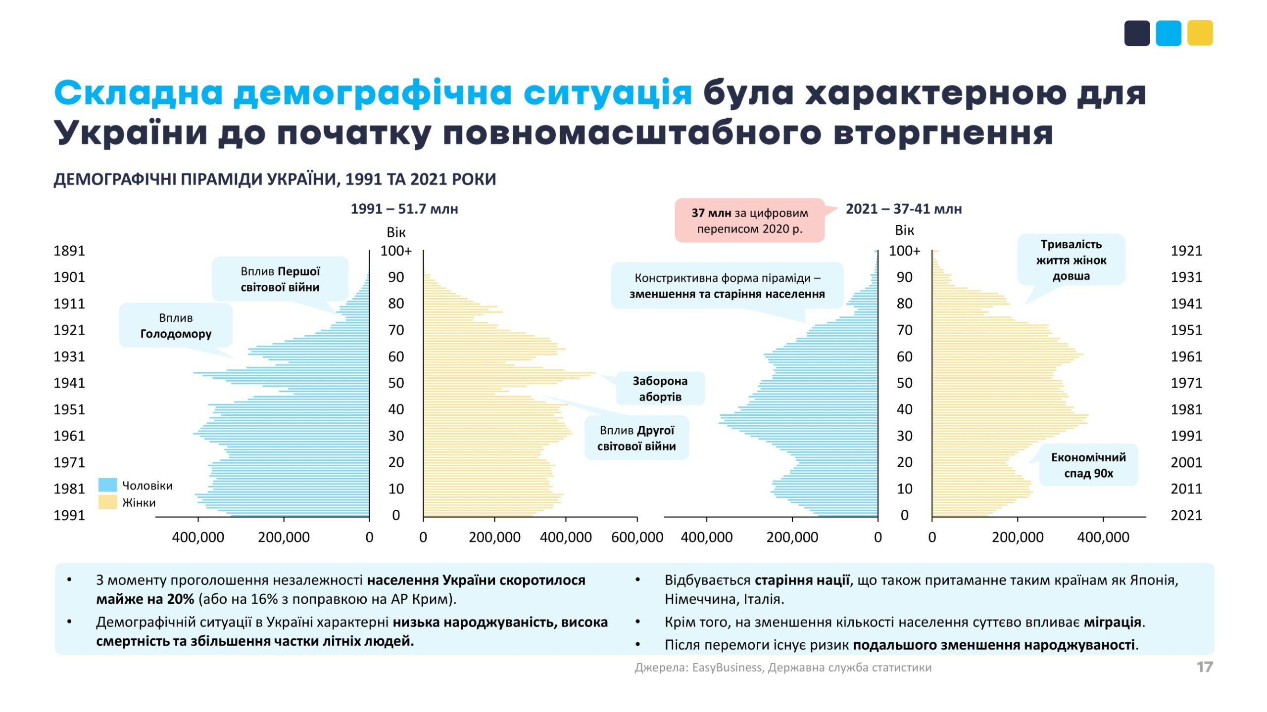Якщо в 1991 році незалежна Україна мала 51,7 млн населення, то вже через три десятиліття, у 2021 році, населення країни скоротилося орієнтовно до 37-41 млн осіб. Цьому сприяли низька народжуваність та висока смертність, збільшення частки літніх людей. Старіння нації притаманно не тільки Україні, але й таким країнам як Японія, Німеччина та Італія. Тому варто шукати шляхи компенсації цих втрат, які лише збільшилися через еміграцію та воєнні дії.