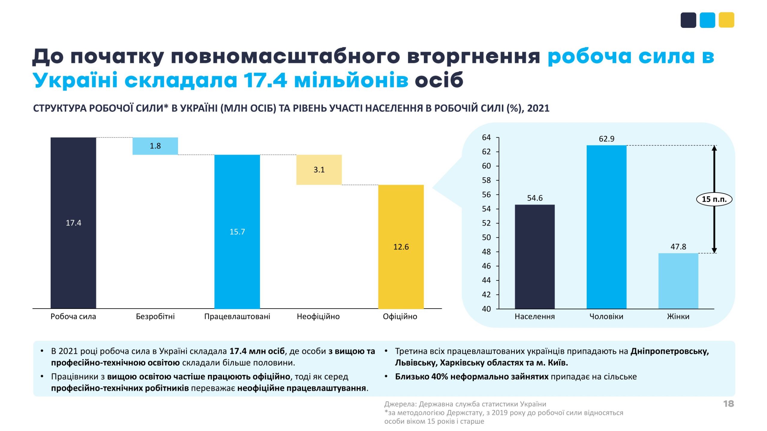 Власне робоча сила в Україні у до війни складала 17,4 млн осіб, де особи з вищою та професійно-технічною освітою складали більше половини. Офіційно працевлаштовані були тільки 12,6 млн людей. Причому рівень участі чоловіків в робочій силі складав 63% проти 48% у жінок у 2021 році. Ця різниця в 15% є приводом для прийняття рішень, які могли б підвищити залученість жінок в економіці, що вже частково відбувається.