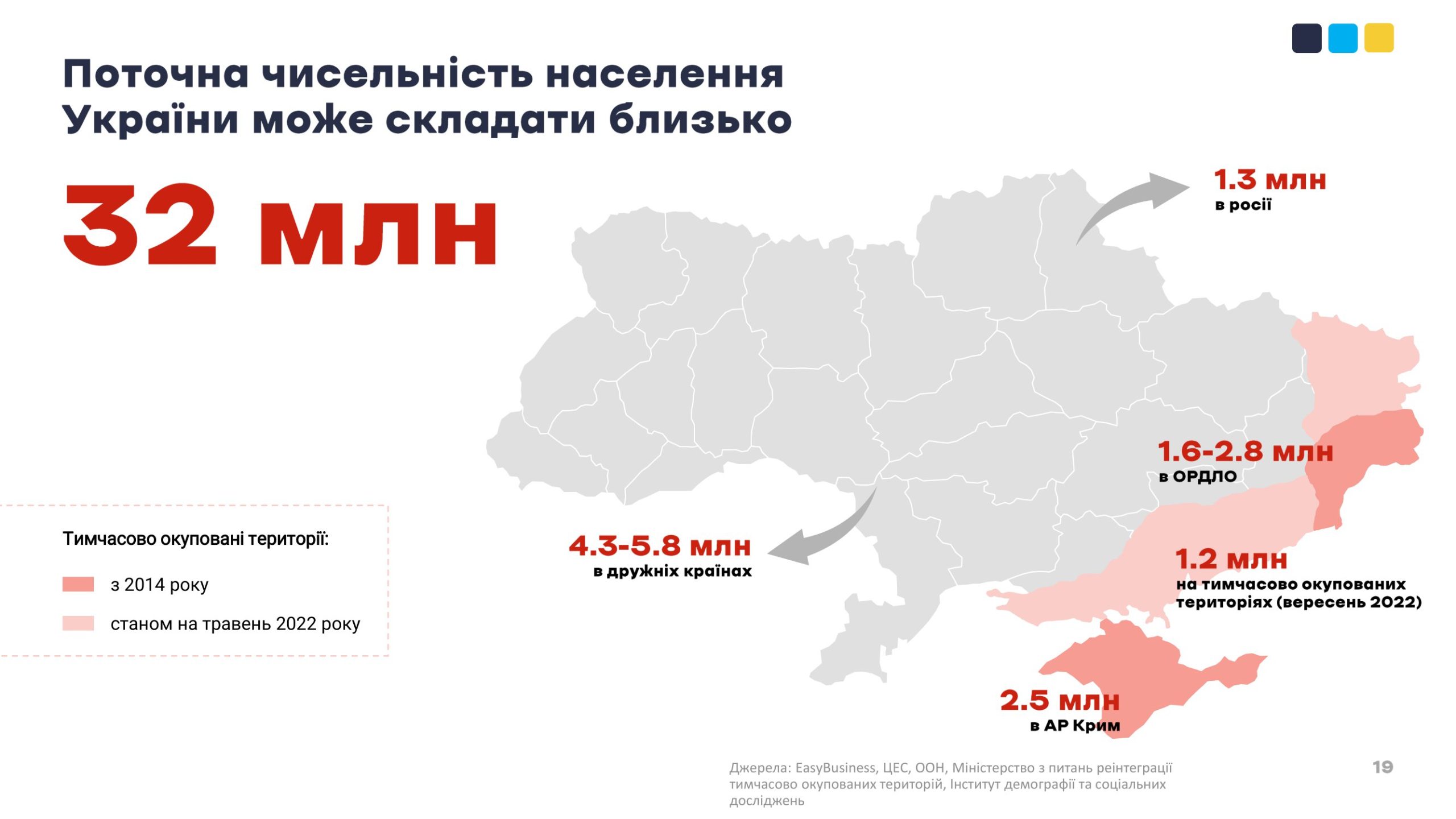 Через війну кількість наявного населення України впала, і наразі оцінюється в 32 млн людей (за даними Інституту демографії та соціальних досліджень). Частина з них виїхали за кордон, частина – знаходяться в окупації.