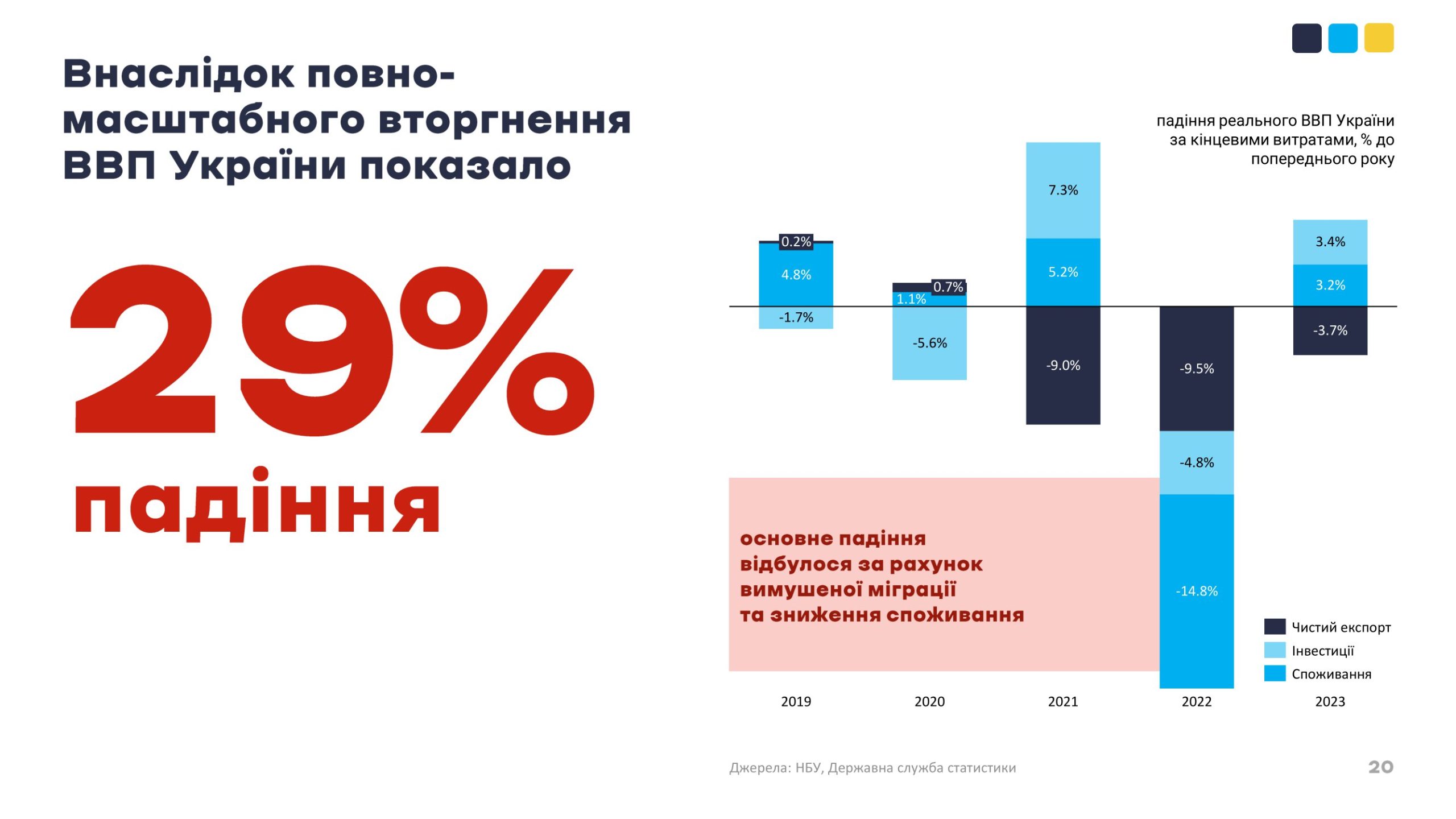 Також скоротився ВВП – на 29% у 2022 році. Це сталося головним чином якраз через міграцію та зниження споживання товарів і послуг. Водночас скоротилися чистий експорт та інвестиції. Лише завдяки згуртованості бізнесу, його швидкій адаптації до нових умов вдалося уникнути песимістичного сценарію, прогнозованого іноземними експертами на рівні 35-45% падіння українського ВВП. Вже за результатами 2023 року економіка показала зростання на 4-5%, в основному за рахунок збільшення споживання та інвестицій. Чистий експорт все ще знаходиться в негативному тренді.