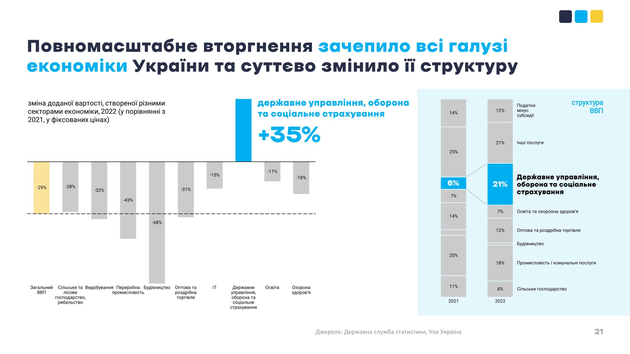 Очікувано єдиним сектором економіки, який показав зростання на 35% у 2022 році, був сектор державного управління, оборони та соціального страхування. Найбільше скорочення зафіксовано у будівництві (-68%), переробній промисловості (-43%) та видобування (-32%).