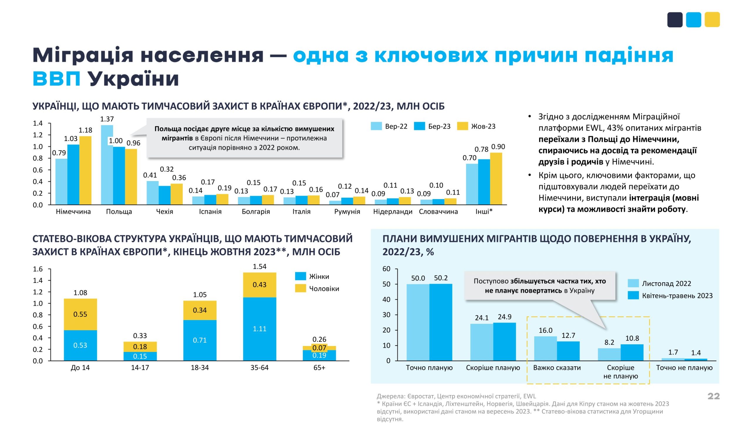 Як уже зазначалося, внутрішня та зовнішня міграція населення є одним із головних чинників падіння ВВП України. Переважно закордоном перебувають жінки з дітьми. Це, як правило, освічені та кваліфіковані фахівці, які досить швидко знаходять собі роботу в країні перебування і тому все більша частка таких людей не планує повертатися додому. Чим довше час перебування в евакуації: тим менше бажання повертатися. Водночас йде міграція українських біженців із Польщі в Німеччину, де кращі умови перебування та заробітку.