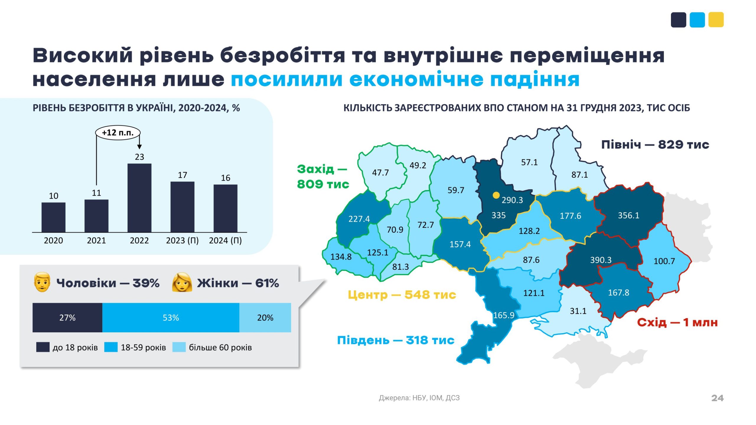 Всупереч розповсюдженій думці, переважна кількість жителів східних регіонів країни не поїхали далеко на Захід чи в столицю, а перемістилися у більш безпечні місця в межах регіонів свого попереднього перебування. Але якщо у перший рік повномасштабної війни рівень безробіття подвоївся, сягнувши 23%, то надалі, за прогнозами Мінекономіки, цей показник матиме тенденцію до зниження через те, що люди поступово знаходять роботу і баланс відновлюється.