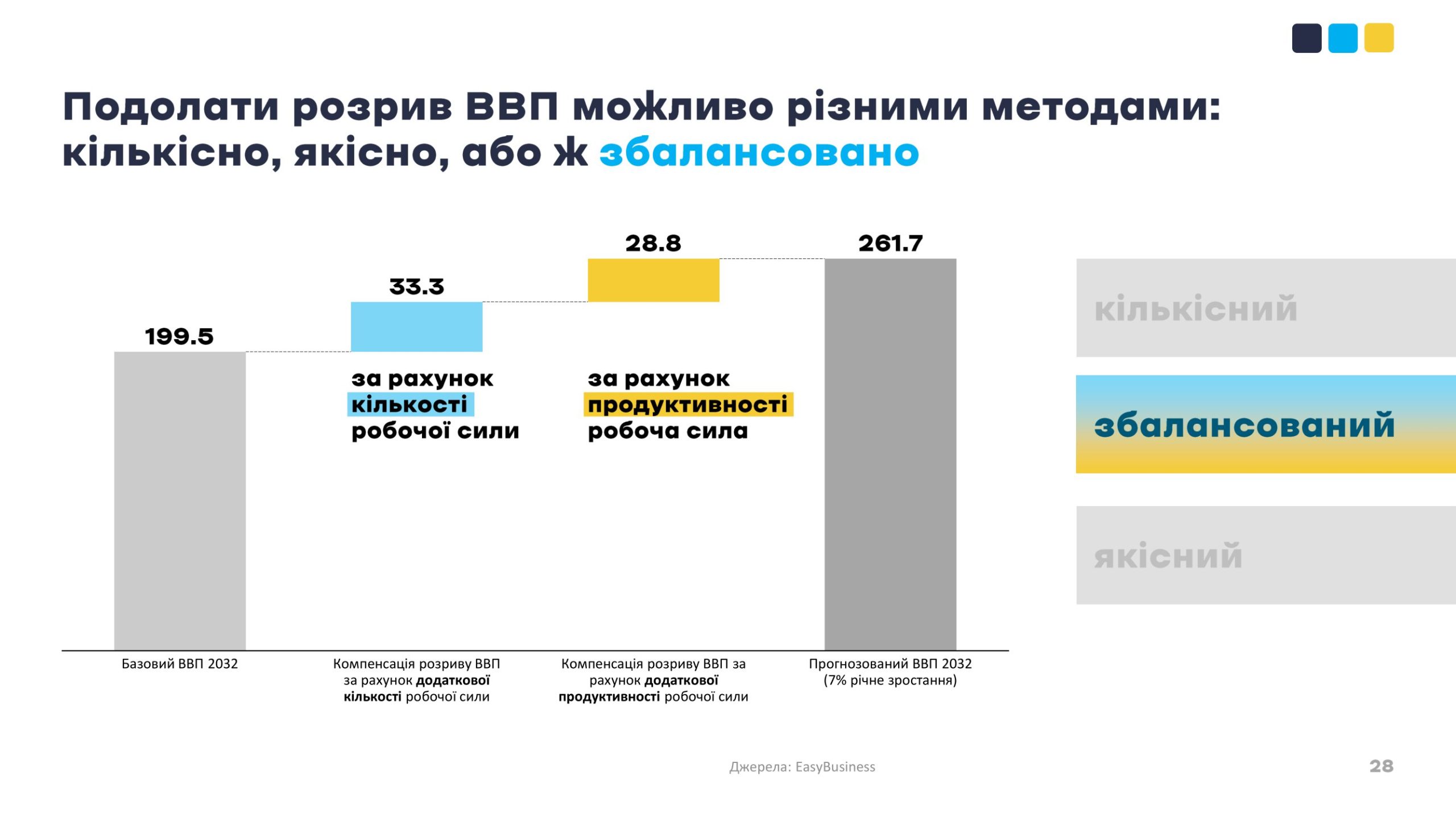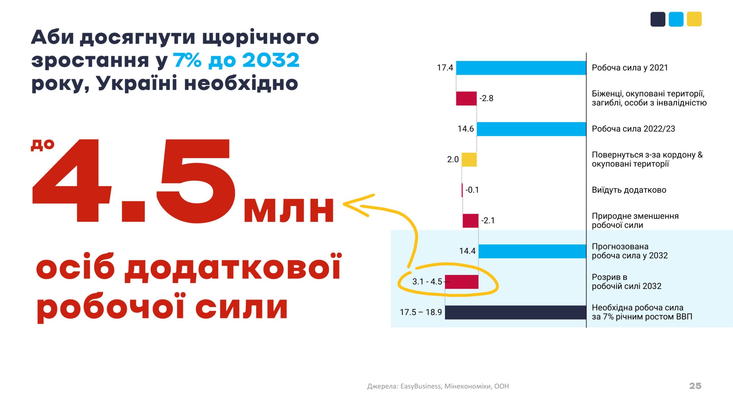 Наразі більшу частину ВПО (61%) становлять жінки, а більше половини ВПО – це люди віком від 18 до 59 років. Для забезпечення щорічного середнього зростання ВВП на 7% до 2032 року країна має додатково залучити близько 4,5 млн осіб.