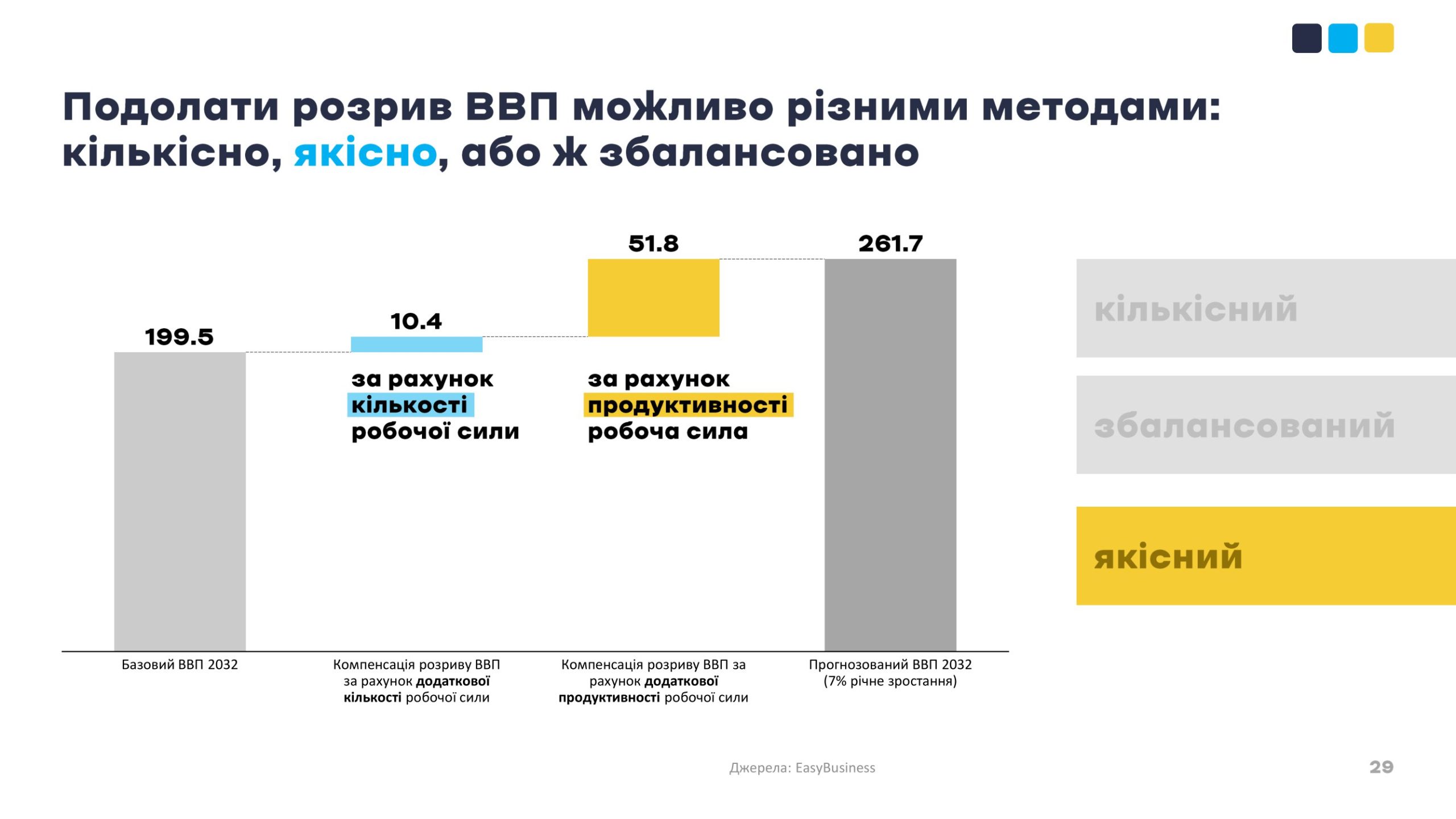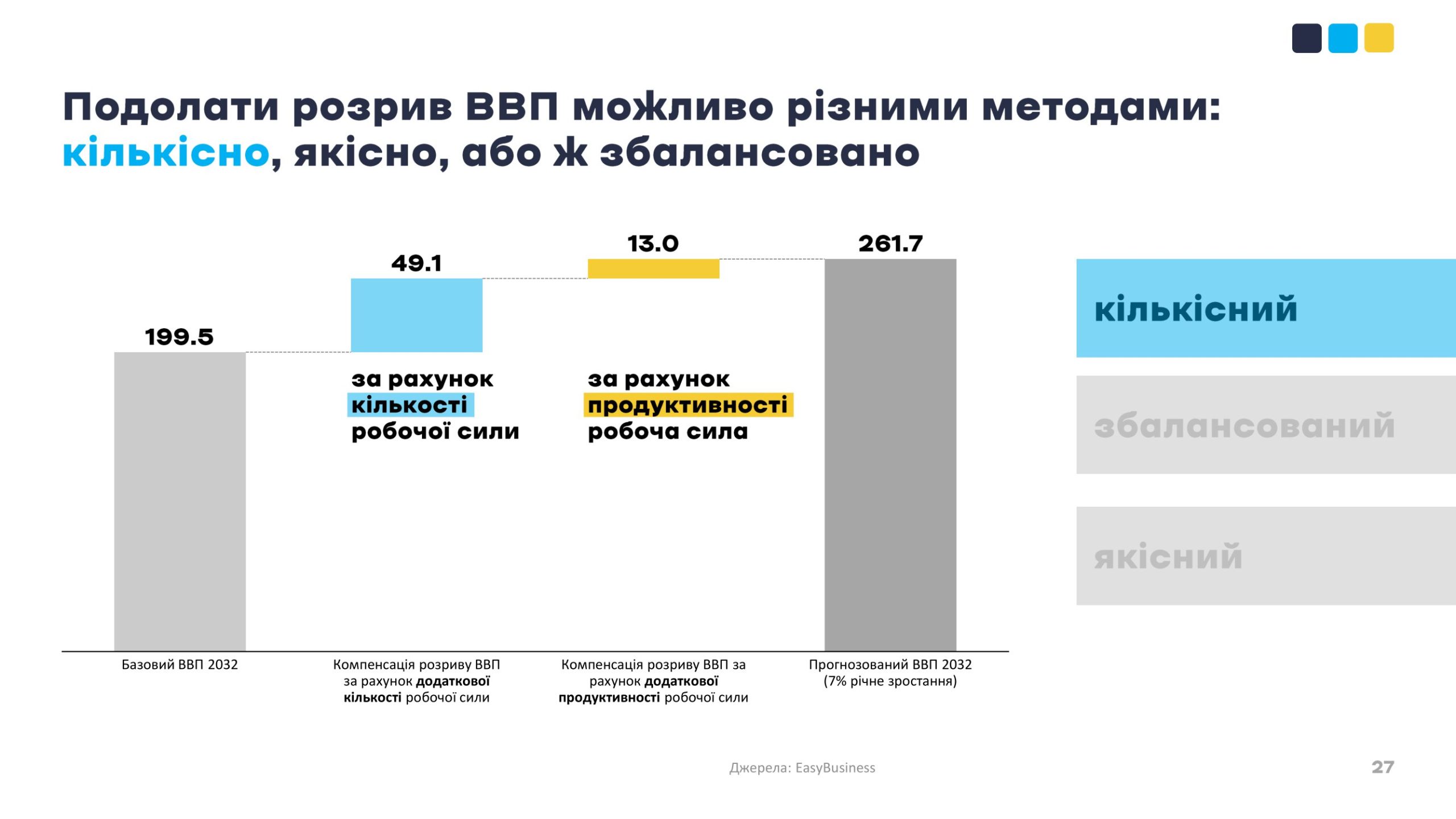 Існує декілька методів вирішення проблем з подоланням розриву ВВП. Перший – кількісний, який передбачає залучення додаткової кількості робочих рук. Основні зусилля, безумовно, варто прикласти для повернення тих, хто виїхав за кордон, а також залучення української діаспори (в тому числі як джерела нового досвіду). Додатково компаніям загалом і ритейлерам зокрема, варто продумати, на яких умовах було би можливо залучати іноземних спеціалістів, аби покрити існуючий дефіцит кадрів.
