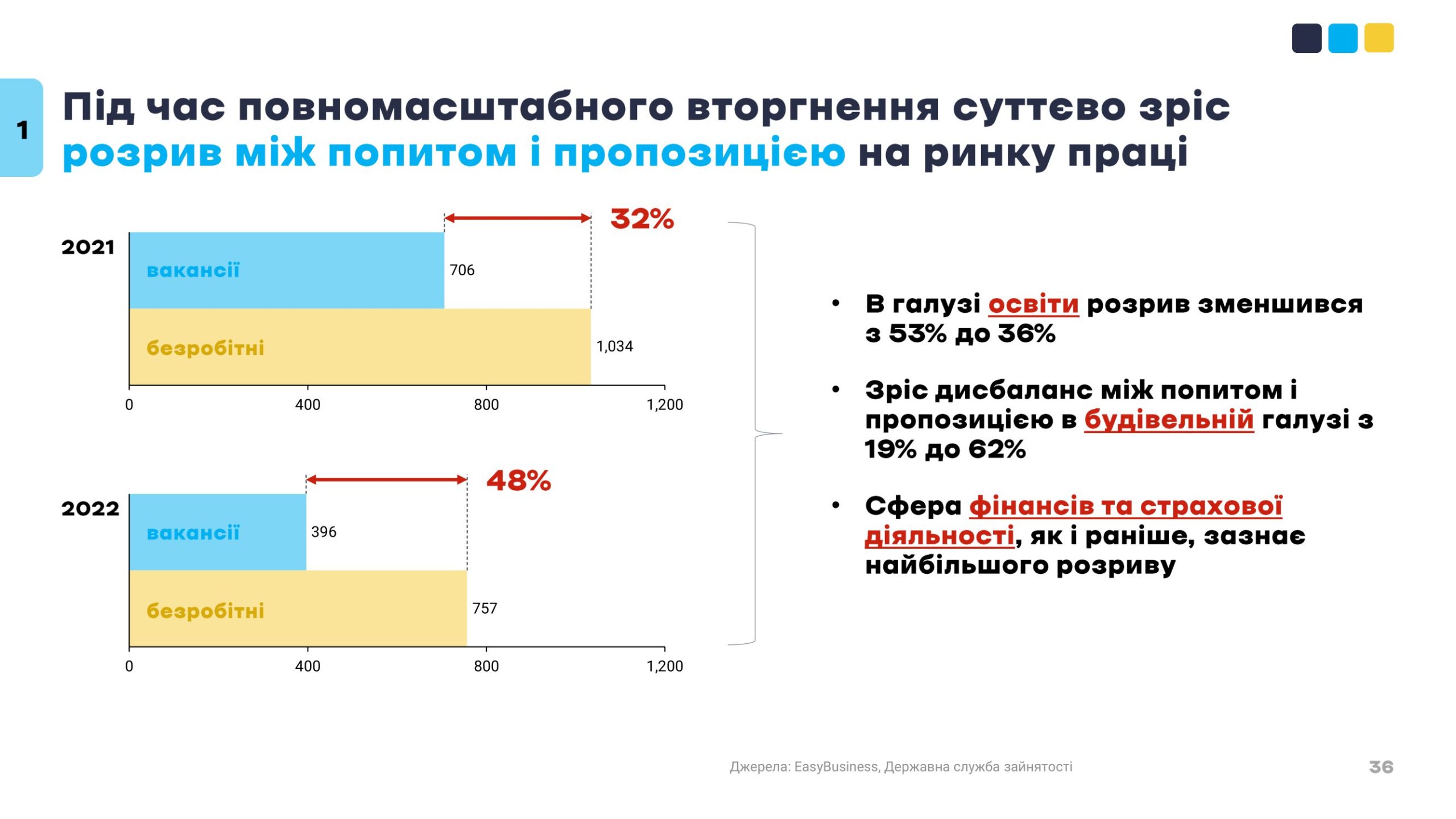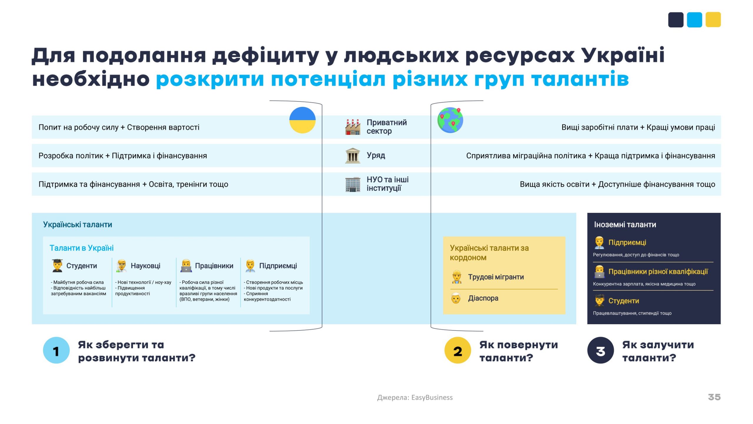 Відповідно виникає три питання: як зберегти та розвинути місцеві таланти, як повернути їх з-за кордону та як залучити іноземні таланти. Поки що рівень безробіття в Україні досить великий. Під час війни поглибився розрив між наявними вакансіями та кількістю безробітних (з 32% в 2021році до 48% в 2022-му). Проте у різних галузях цей дисбаланс між попитом та пропозицією дуже різниться. Зокрема, в ритейлі відчувається брак фахівців. Тому державна політика має сприяти залученню осіб, які недостатньо представлені на ринку праці. Так, в Україні є 3,5 млн внутрішньо переміщених осіб, 1,2 млн безробітних жінок, 0,9 млн ветеранів та 3 млн людей з інвалідністю.
