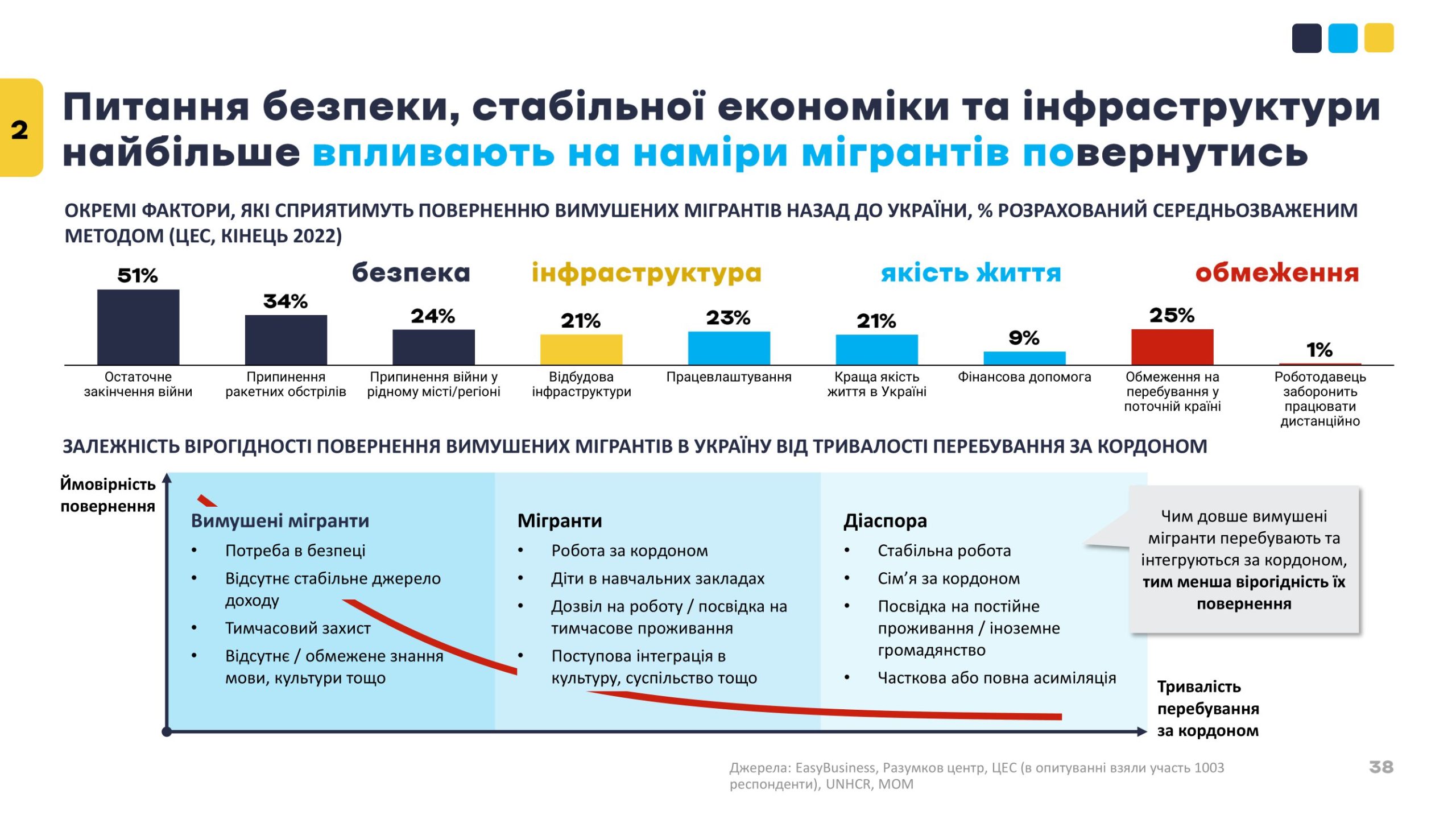 Найбільший потенціал криється в поверненні тих, хто поїхав з країни на заробітки чи в евакуацію. Тільки в Європі мова йде про 4 млн осіб. Але головним критерієм повернення для них є безпека в країні в цілому та конкретному регіоні. Також важлива наявність інфраструктури, оскільки багато хто втратив житло та якість життя в Україні. Частково поверненню додому можуть сприяти обмеження на перебування українців в конкретній країні. І тут час працює не нашу користь, бо чим довше люди знаходяться закордоном тим вірогідніше їх поступове перетворення із вимушених мігрантів у діаспору.