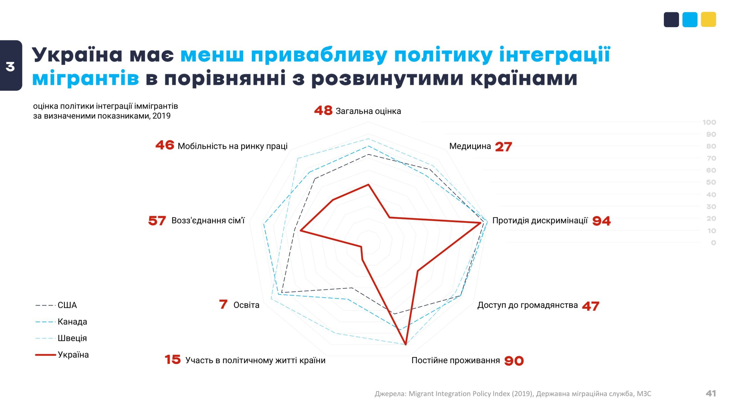 На залучення в Україну іноземних фахівців прямо впливає міграційна політика держави, яка може як стримувати, так і заохочувати їх до релокації. Наразі Migrant Integration Policy Index, який показує привабливість імміграції в Україну, становить 48 пунктів зі 100 можливих. У розвинених країнах, зокрема США, Канаді чи Швеції цей показник значно вищий.