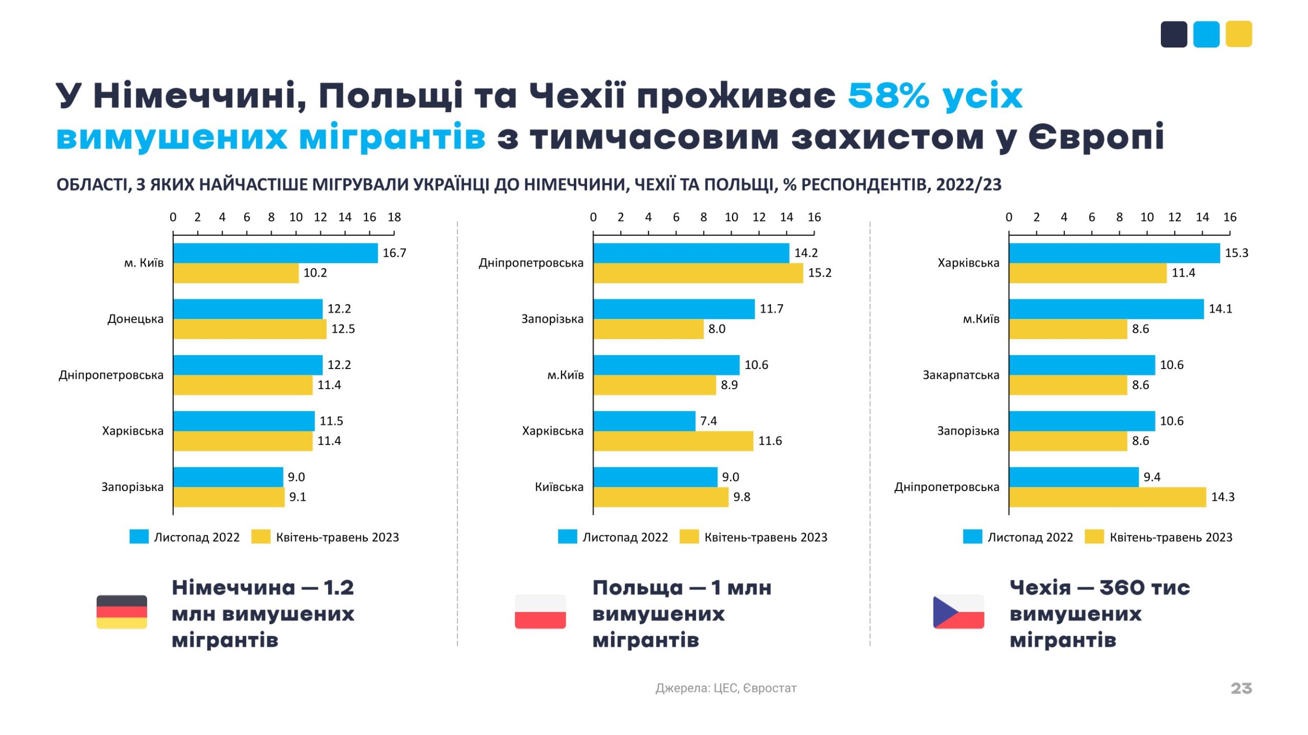 Як уже зазначалося, внутрішня та зовнішня міграція населення є одним із головних чинників падіння ВВП України. Переважно закордоном перебувають жінки з дітьми. Це, як правило, освічені та кваліфіковані фахівці, які досить швидко знаходять собі роботу в країні перебування і тому все більша частка таких людей не планує повертатися додому. Чим довше час перебування в евакуації: тим менше бажання повертатися. Водночас йде міграція українських біженців із Польщі в Німеччину, де кращі умови перебування та заробітку.
