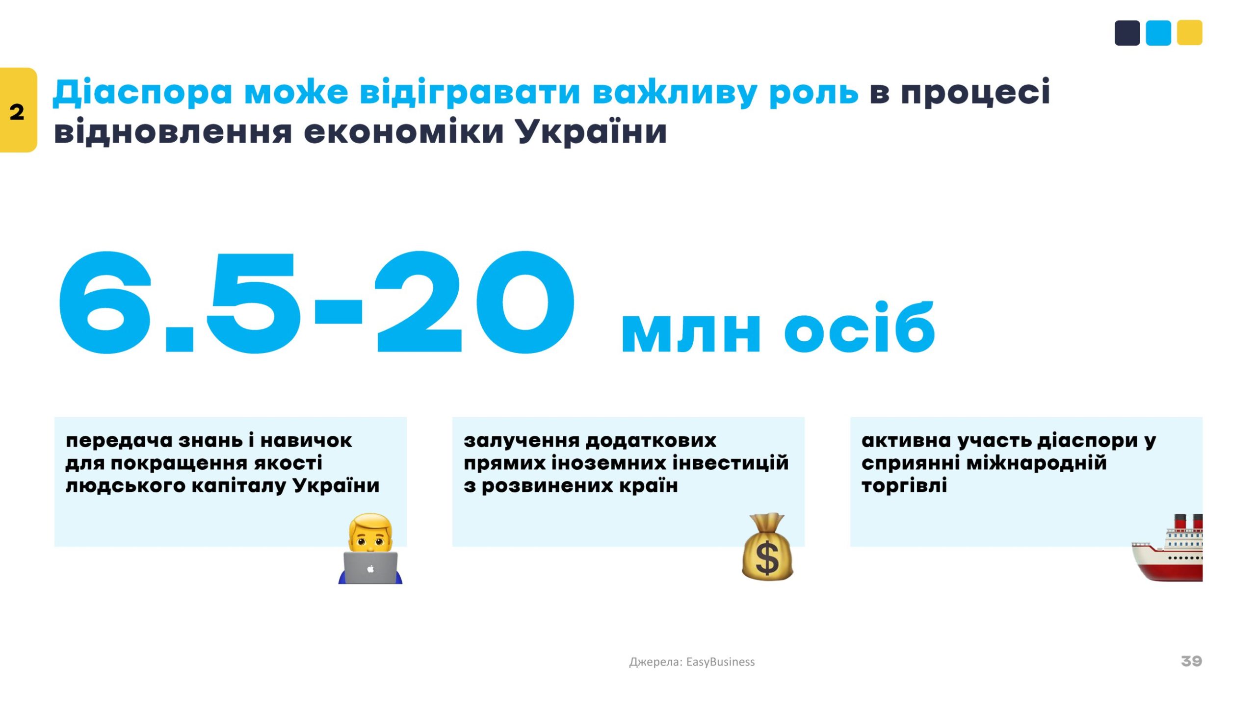 Але й діаспора може відігравати важливу роль у відновленні української економіки. Насамперед за рахунок передачі наявних навичок та знань, залучення додаткових інвестицій, сприяти міжнародній торгівлі.