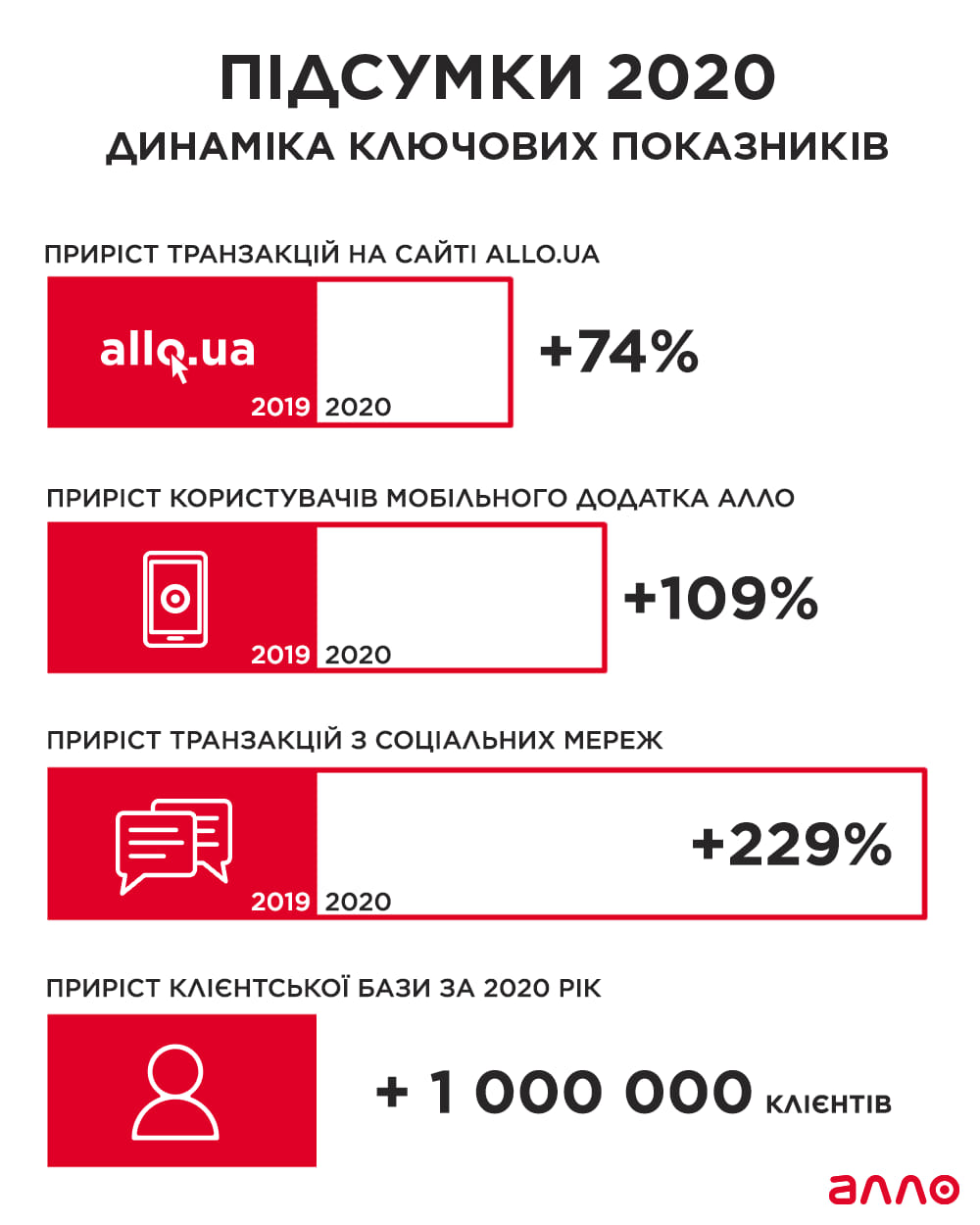 В мережі Алло кількість замовлень через сайт збільшилась на 74%, а через додаток – на 109% у порівнянні з 2019 роком. Приріст клієнтської бази + 1 млн.