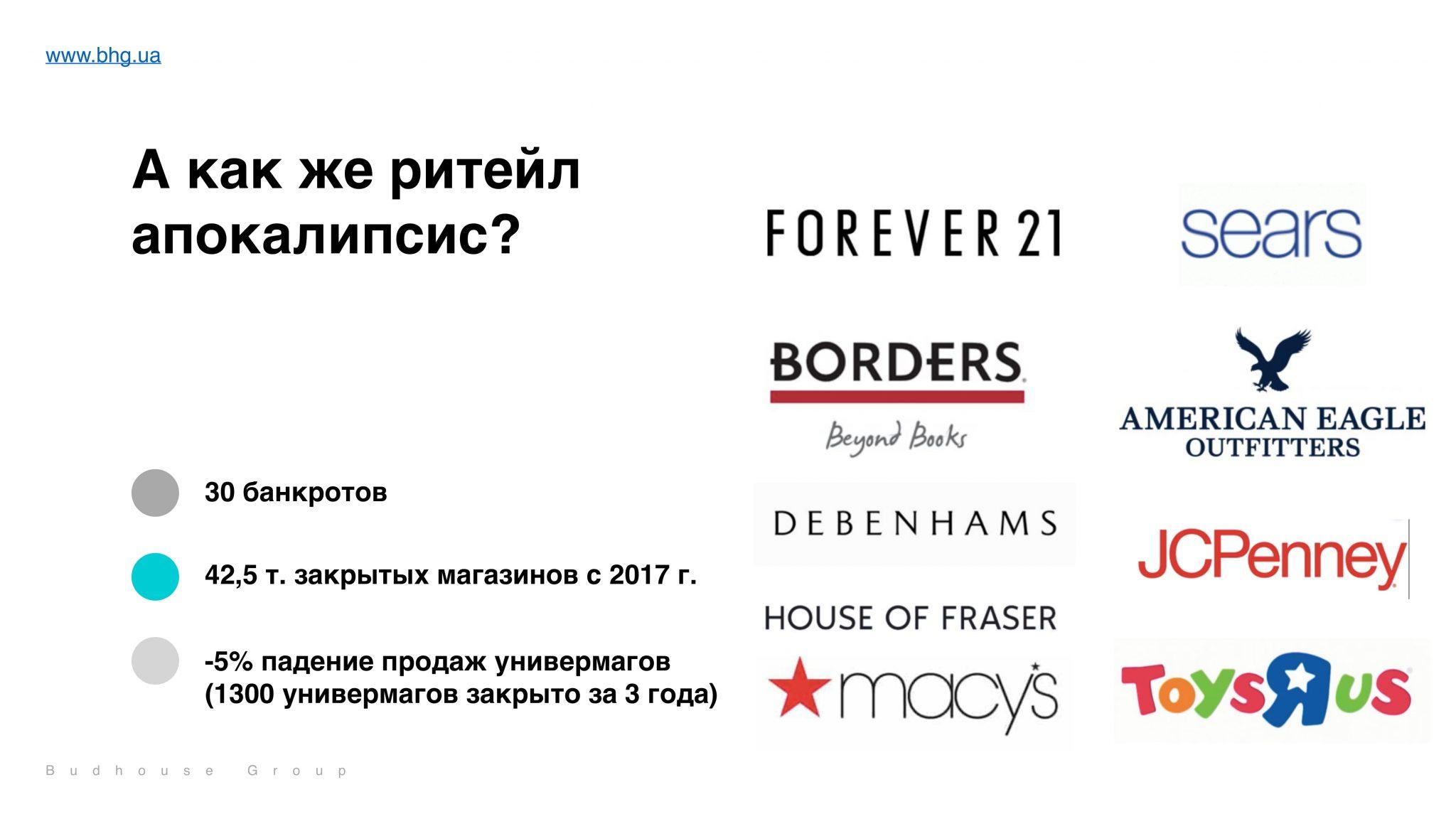 Ще один відомий міф – ритейл-апокаліпсис. Всім відомо, що десятки мереж універмагів оголосили про банкрутство, в тому числі такі гіганти як JC Penney, Debenhams, Macy’s та інші. Офіційна статистика говорить про те, що тільки в 2017 році в США закрилося 42 500 магазинів.