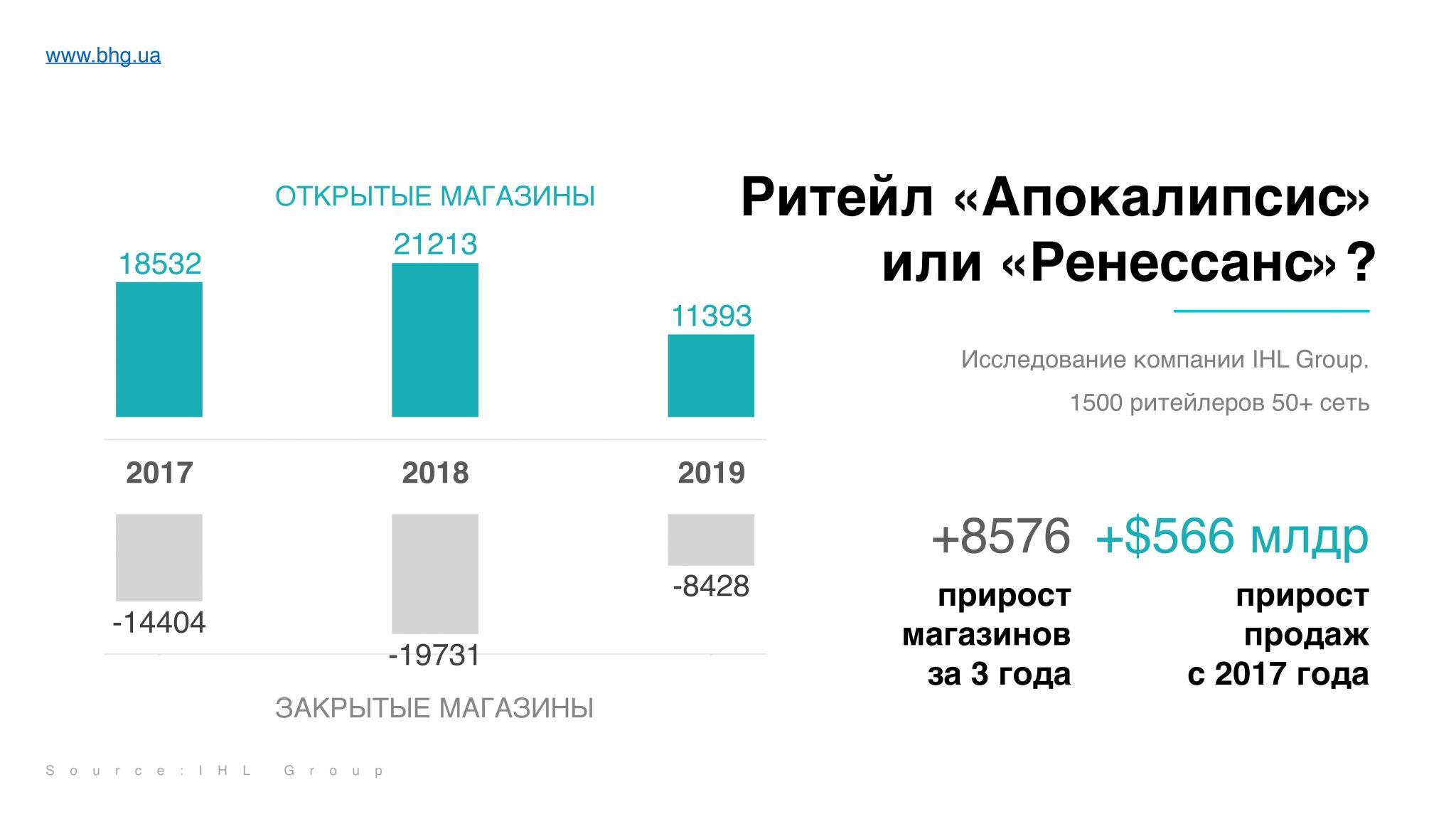 Все це дійсно так: у 2017-19 роках припинили роботу тисячі американських магазинів, але за цей же час відкрили ще більше торгових точок! За останні три роки чистий приріст кількості офлайнових магазинів у США склав більше 8500. При цьому зростання продажів офлайн-роздробу в Штатах за час так званого «рітейл-апокаліпсису» склало $566 млрд.