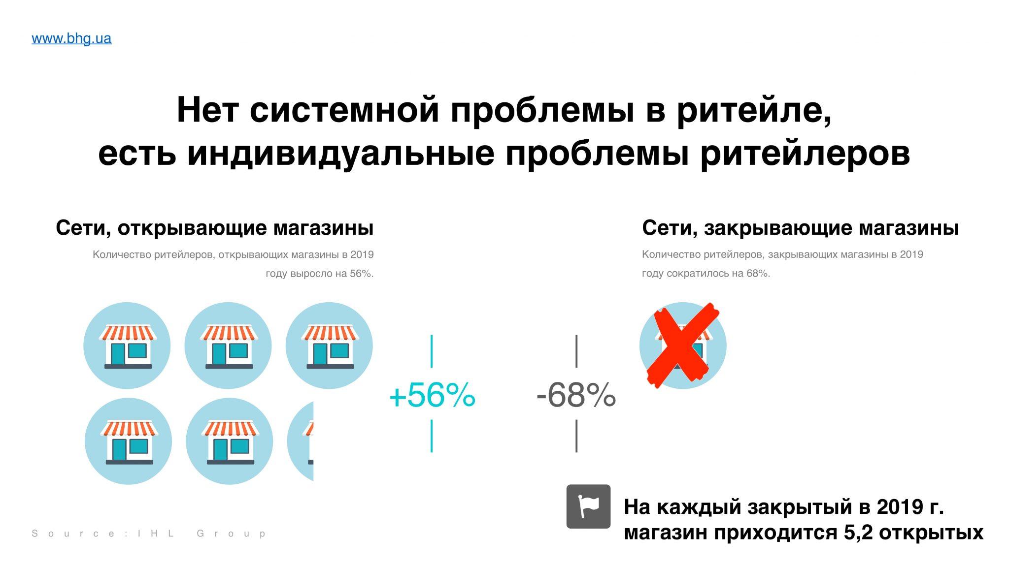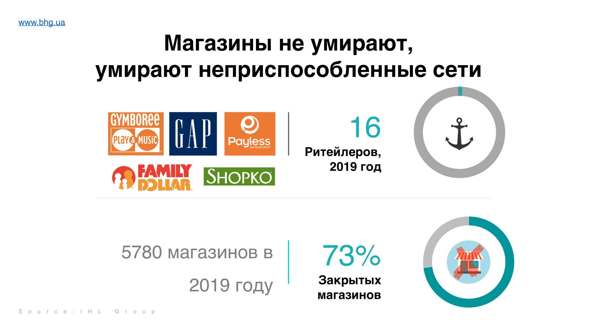 Все це свідчить про те, що системної проблеми в рітейлі немає. Є лише індивідуальні проблеми окремих рітейлерів, які не змогли пристосуватися до нових умов і викликів часу. Цю думку підтверджує і той факт, що 73% закритих магазинів в США за останні три роки припадає на 16% рітейлерів.