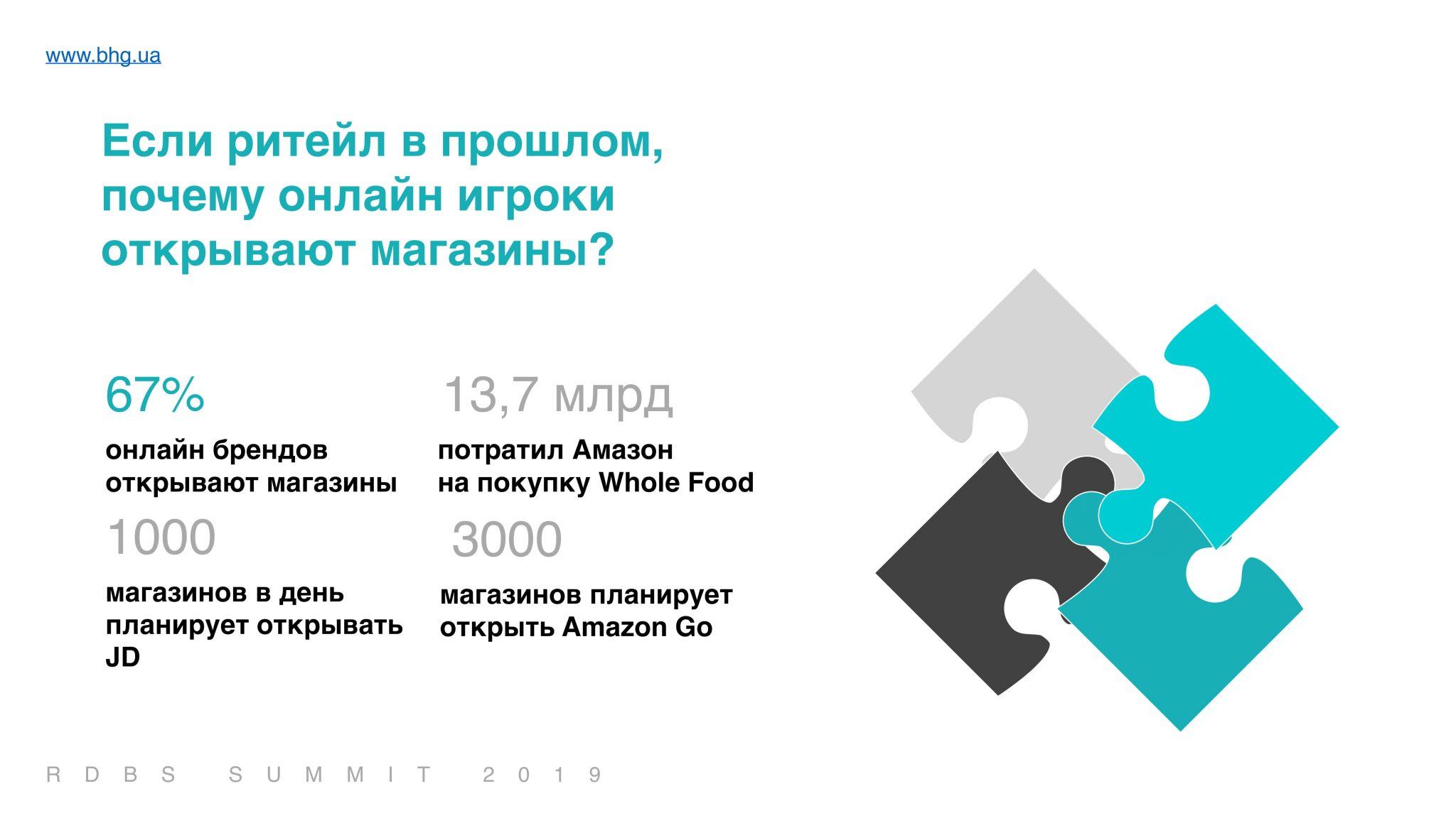 Нещодавно Amazon придбав мережу Whole Foods майже за $14 млрд, у неї є магазини Amazon Books і Amazon 4-star, а в планах – відкриття 3000 точок Amazon Go. І це відбувається не тільки з Amazon, але й з іншими найбільшими онлайн-рітейлерами, такими як Alibaba, JD, Casper та інші.
