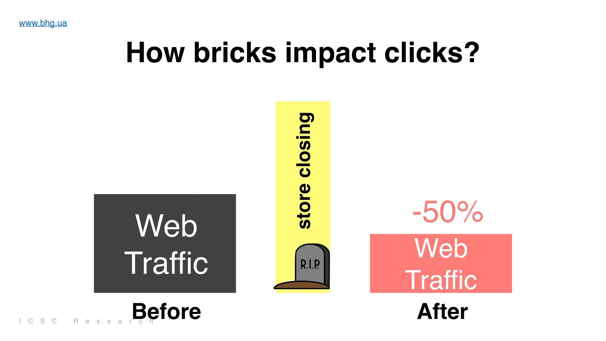 В ході одного з них ми намагалися проаналізувати, яким чином відкриття фізичного магазину впливає на веб-трафік цього ж рітейлера. Як з’ясувалося, запуск торгової точки в наступні три тижні збільшує трафік онлайн-магазину більш ніж на третину. У той же час, коли офлайн-магазин закривається, то веб-трафік в середньому падає на 50%.