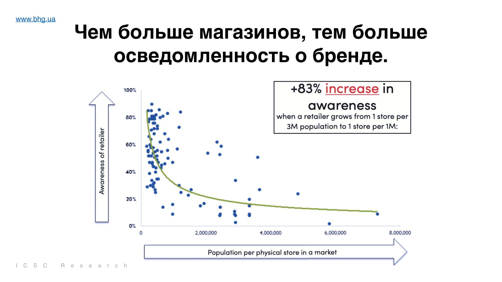 При цьому впізнаваність і обізнаність про бренд істотно підвищується з кількістю магазинів, які є у бренду в певній локації. Наприклад, якщо у бренду був один магазин на мільйон жителів в певній локації, а потім їх стало три, то поінформованість людей про цей бренд збільшувалася на 83%.