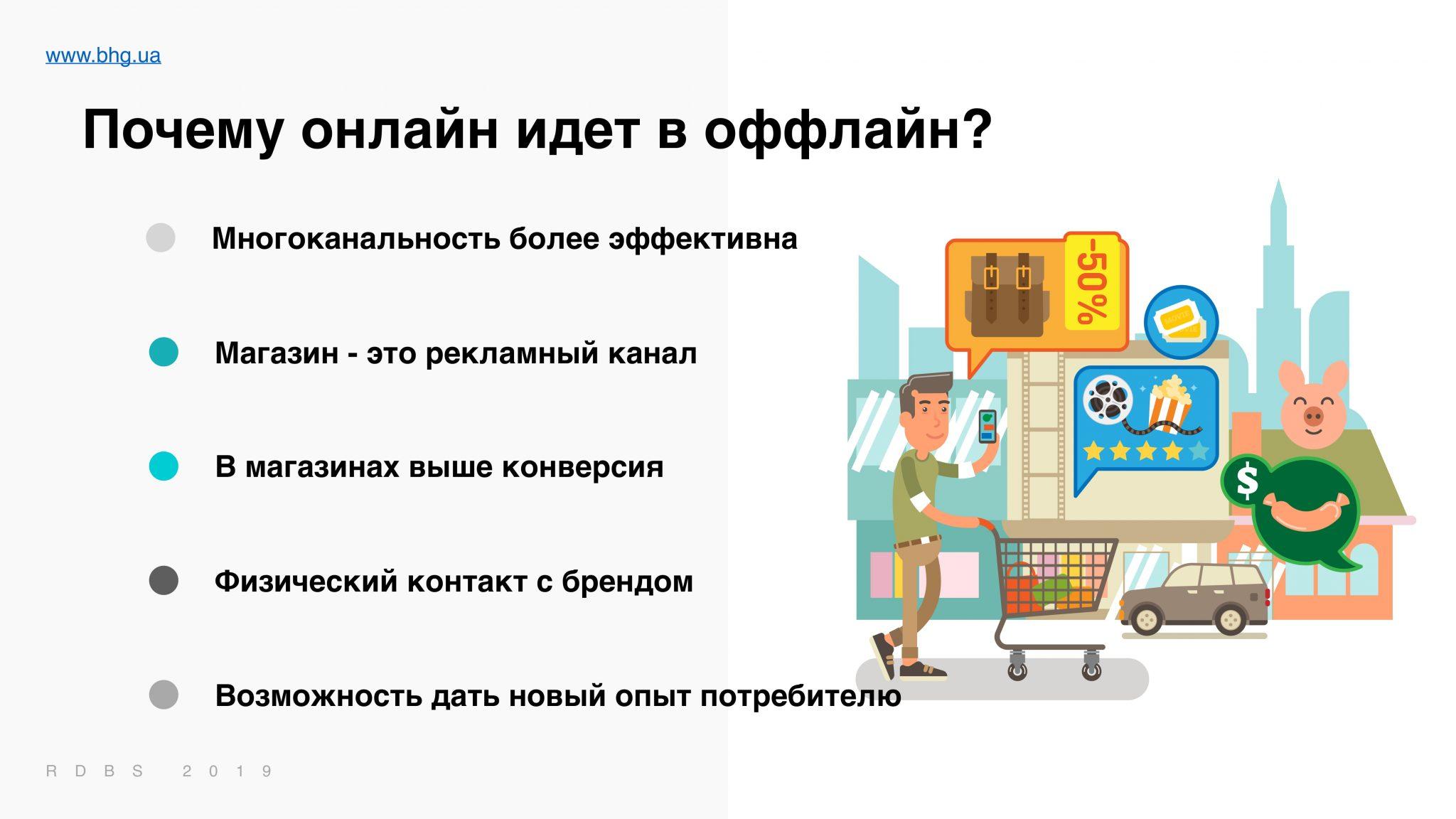 Ще один цікавий факт: якщо людина робила покупку в онлайн-магазині в середньому на $100, то протягом наступних 15 днів після цієї покупки вона витрачала додатково ще $131 на придбання товару в офлайн-точці того ж бренду. І навпаки: якщо спочатку покупка була зроблена офлайн на $100, то в наступні 15 днів покупець витрачав ще $167 в онлайні. Це свідчить про те, що омніканальний покупець витрачає набагато більше, ніж моноканальний. Висновок – багатоканальність більш ефективна. А онлайн-рітейлери йдуть в офлайн з кількох причин: